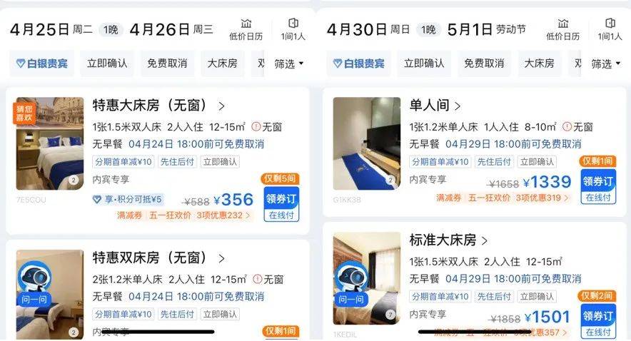 帝都也一样,原价356一晚的速7+1,还是那种没窗的,现在最高涨到1500,翻了4倍。