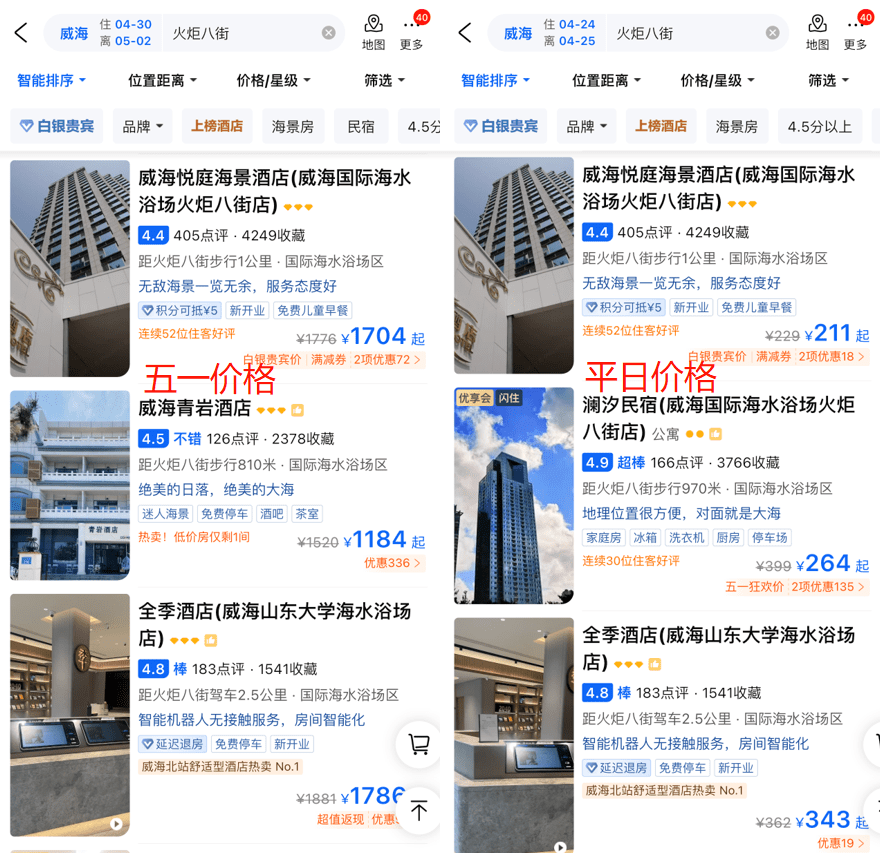 而今年葱省现在成了旅游顶流,看了下威海卫的价格,最高翻8倍,当自己是滨州了?这是想干啥啊?