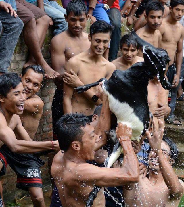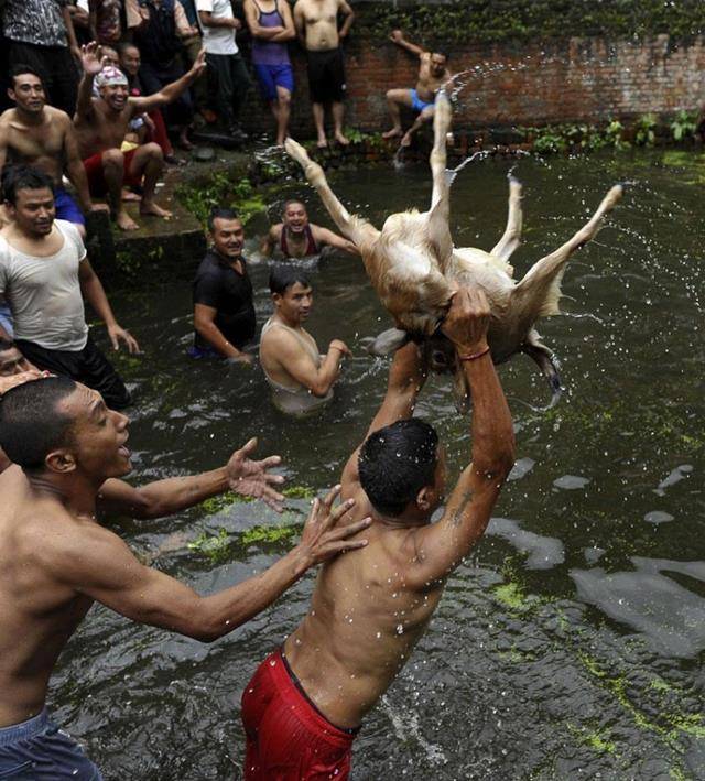 节日到来的时候,他们会把一只6个月左右的山羊丢到池塘里面,然后就会有9名年轻力壮的小伙子跳进池塘,通过手撕、牙咬的方式将山羊撕碎,好好的一头山羊,就这么被残忍撕裂献祭了。