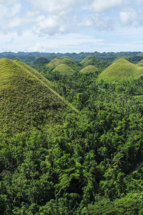 巧克力山的植被也具有奇异之处。处在亚热带和热带临海地区的山,因雨量充沛,山上的植物都疯着长。巧克力山周围其他形态的山无不如此,独独这种特大号的“超级馒头”,却是基本上只长草不长树,更称不上有林。