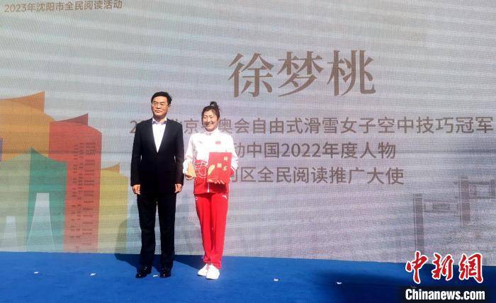 沈阳市沈河区区委书记林宇航向徐梦桃颁发“全民阅读推广大使”聘任书。 赵桂华 摄