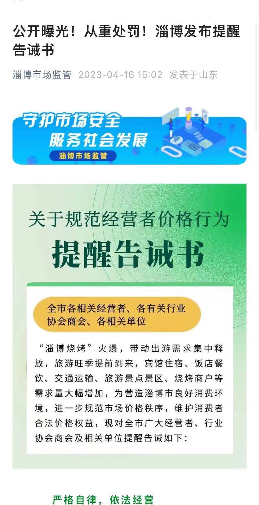 4月16日,山东淄博市市场监督管理局官微发布《关于规范经营者价格行为提醒告诫书》。其中提到,各相关经营者要严格遵守相关等法律法规,加强价格自律,遵循公平、合法、诚实、信用原则,为广大消费者提供价格合理的商品和服务,自觉维护市场价格秩序和公众利益。
