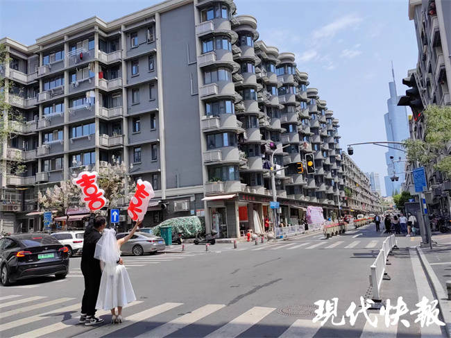小张和小陈举起“喜”字气球,摄影师以西桥为背景,“咔嚓”一声,为他们拍出一张时尚摩登的婚纱照。“我们来自山东,定居在南京,婚纱照的场景都是我们自己选的小众打卡点,很有南京的特色。”