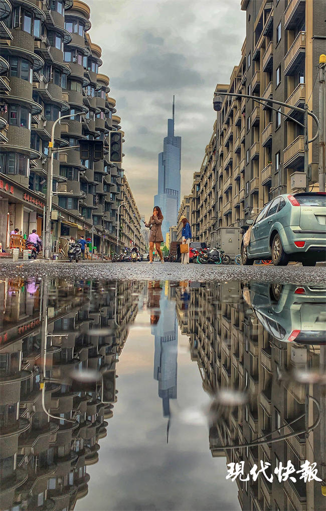 有人模仿披头士拍摄走斑马线时的侧面照,有人拍摄复古港风、朋克风的照片……从无人机的视角看到,镜头朝着紫峰大厦推进,仿佛穿越时空,新旧重叠,城市的另一面逼近视野。