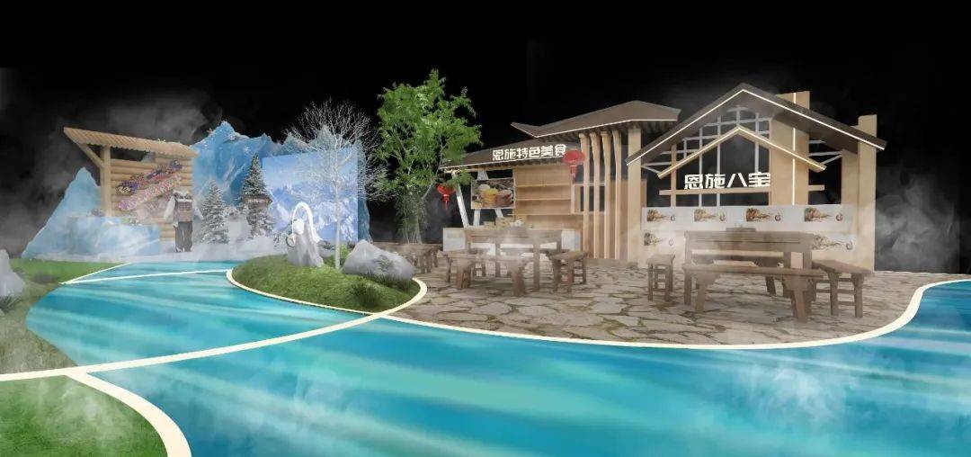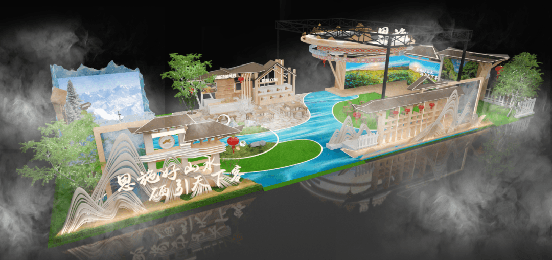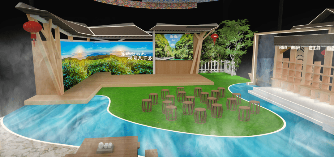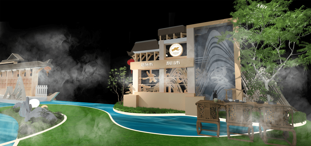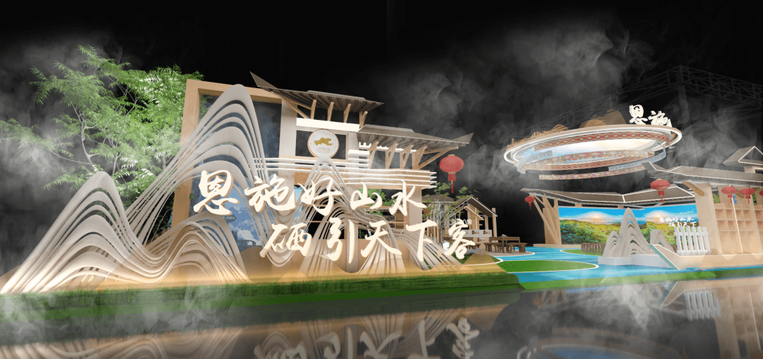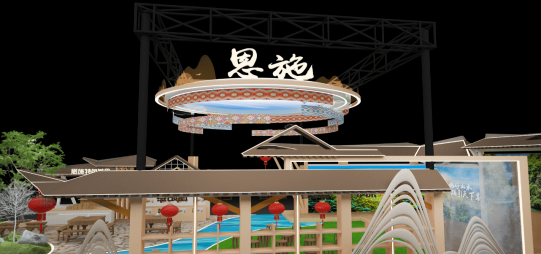恩施州展馆以“恩施好山水 硒引天下客”为主题,以“青山绿水”作为主色调,以山水写意勾勒展台地屏,通过连绵的格栅造型,展现出恩施的特色。展馆结构造型以土家传统村落为灵感,借用土家吊脚楼飞檐翘角,西兰卡普等元素装饰,凸显恩施独有地域特色,再现了土家先民生活场景和生活方式,依托现有山水脉络等独特风光,让来宾们走进恩施馆即可在这里望得见山、看得见水、记得住乡愁,充满烟火气和人情味。