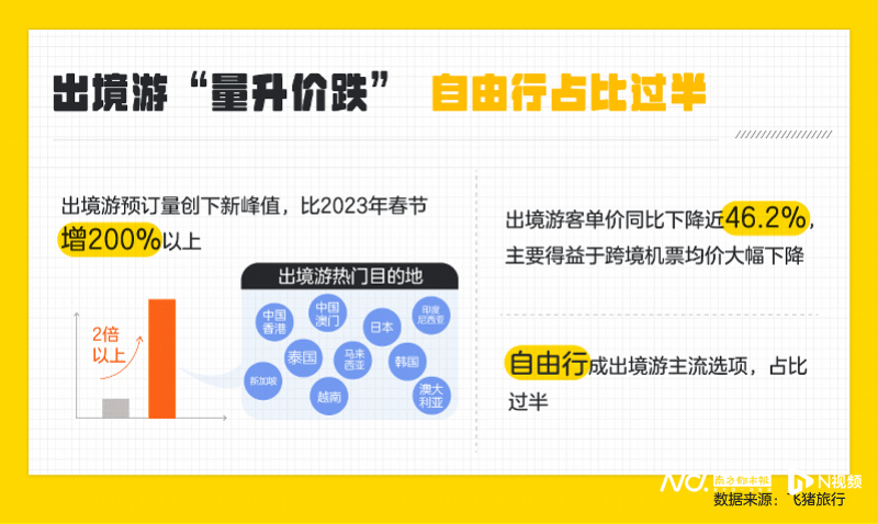 “玩得酷”的另一大特征体现在出境游上。整体来看,出境游需求在“五一”加速释放,并呈现出“量升价跌”的趋势。飞猪的“五一”出境游预订量创下新峰值,相较2023年春节假期又增长200%以上。中国香港、泰国、日本、马来西亚、韩国、中国澳门、新加坡、越南、印度尼西亚、澳大利亚等是热门目的地,埃及、阿联酋、意大利、越南、法国等也迎来快速增长。值得一提的是,得益于跨境机票的价格持续下降,出境游客单价同比下降46.2%。