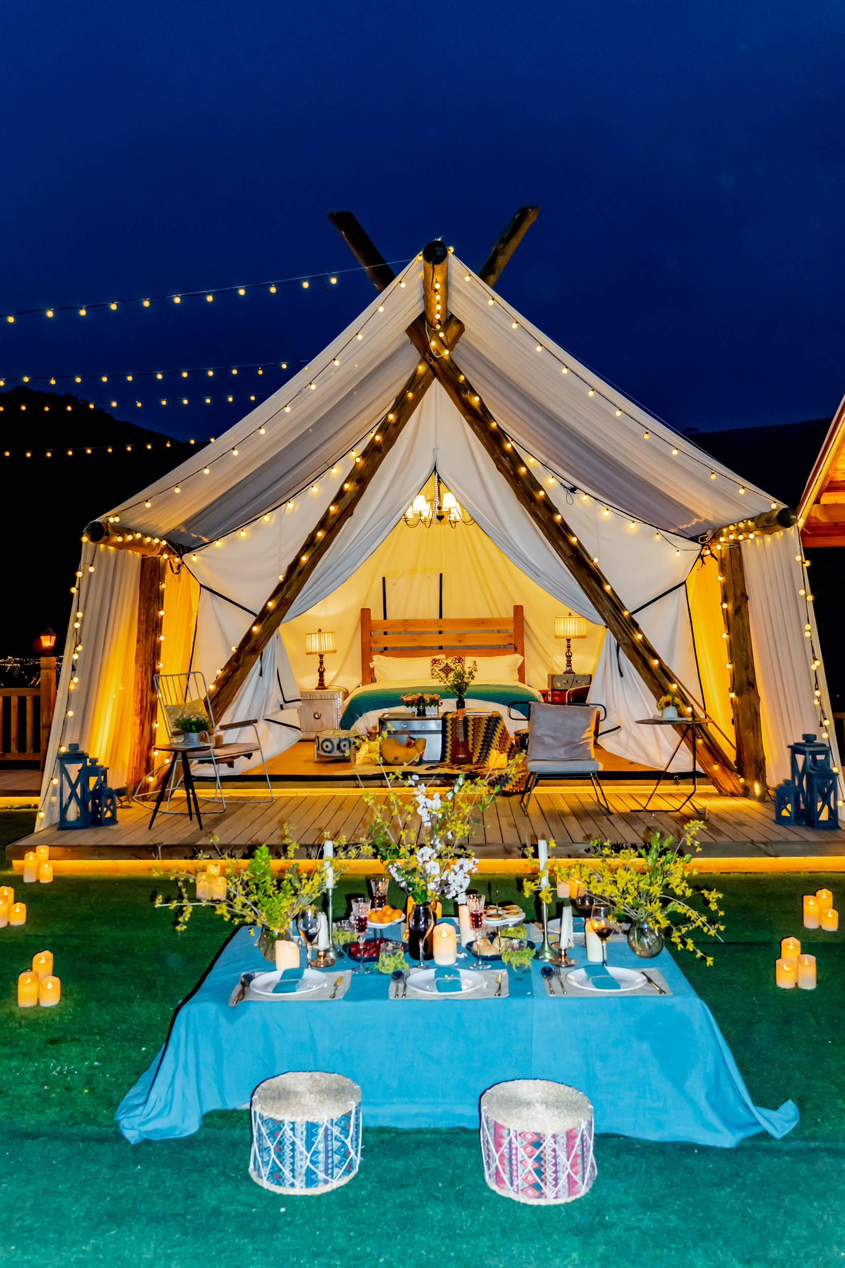 “拎包入住” 一场酒店式的露营体验到底有多美妙。营地不仅提供野奢帐篷,还有野餐桌、天幕帐篷、多功能野炊炉,新鲜食材等一应俱全。如果不知道玩什么,九如艺文小镇里还有30多种手作体验馆,任你挑选喜欢的项目沉浸式感受山野的趣味。