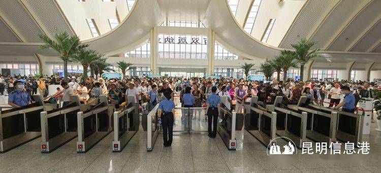 昆明信息港讯 记者上官艳君4月19日,西双版纳站候车大厅内人潮涌动。拎着大包小包的旅客在闸机前排成长龙等待验证进站乘车,身着傣族服饰的工作人员在“丝路·金花”服务台前为旅客提供列车信息咨询、退改签等温馨服务。
