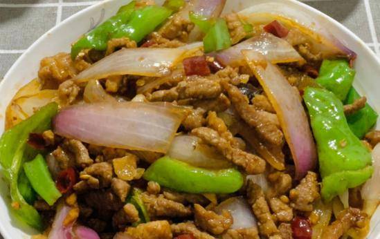锅中放油,将腌好的里脊肉放入锅中煸炒,里脊肉变白之后再将洋葱倒进锅中开始翻炒,翻炒片刻之后把小米椒和生抽倒进去炒匀。最后加入适量的盐调味,再翻炒几下就能出锅。