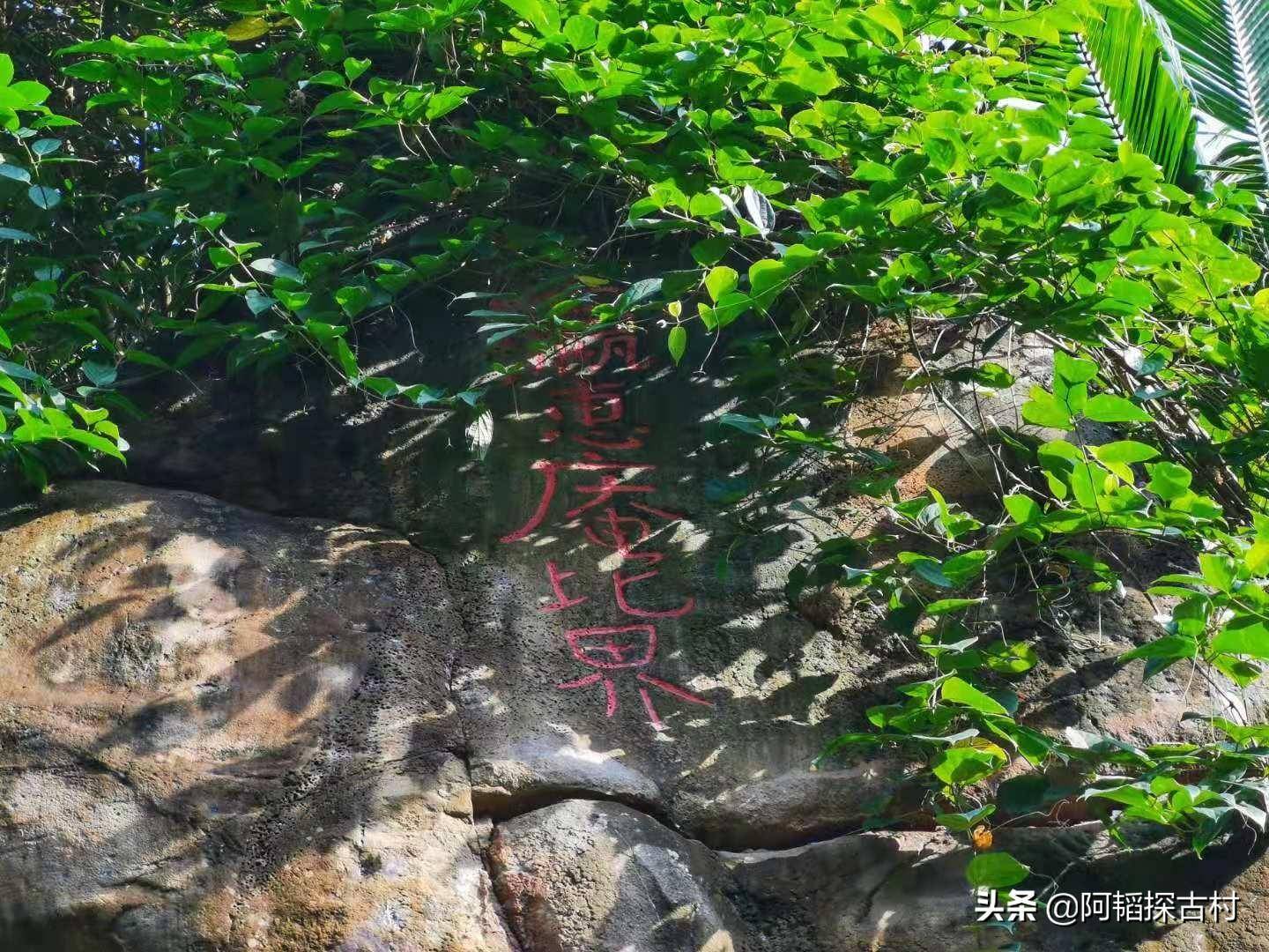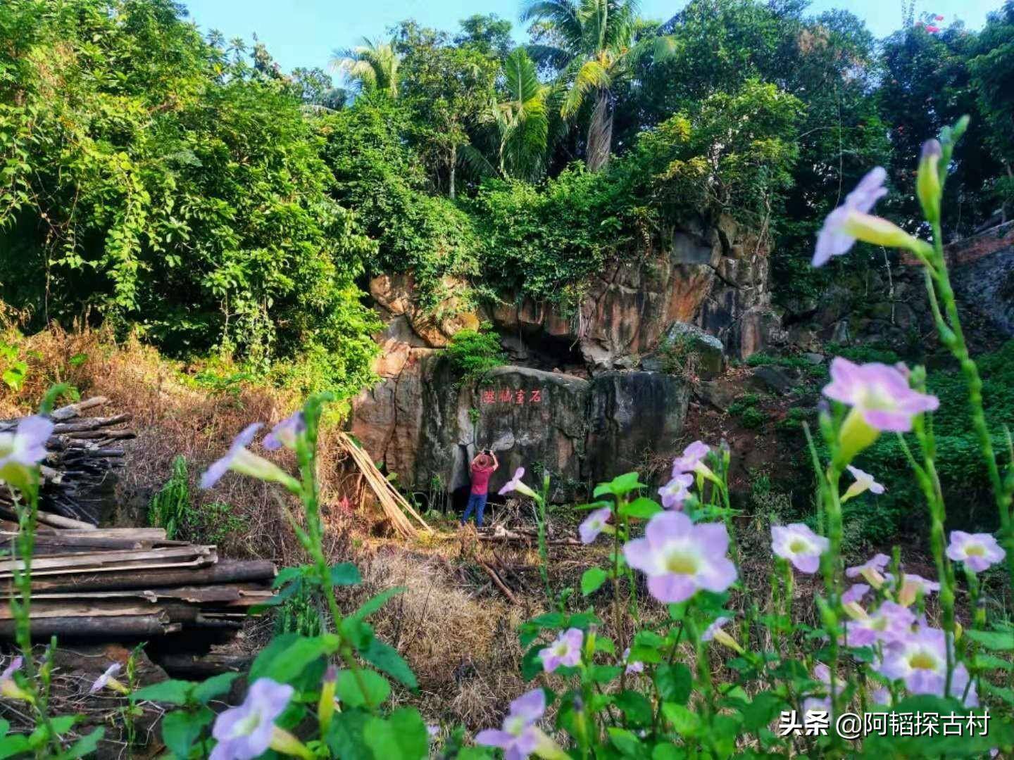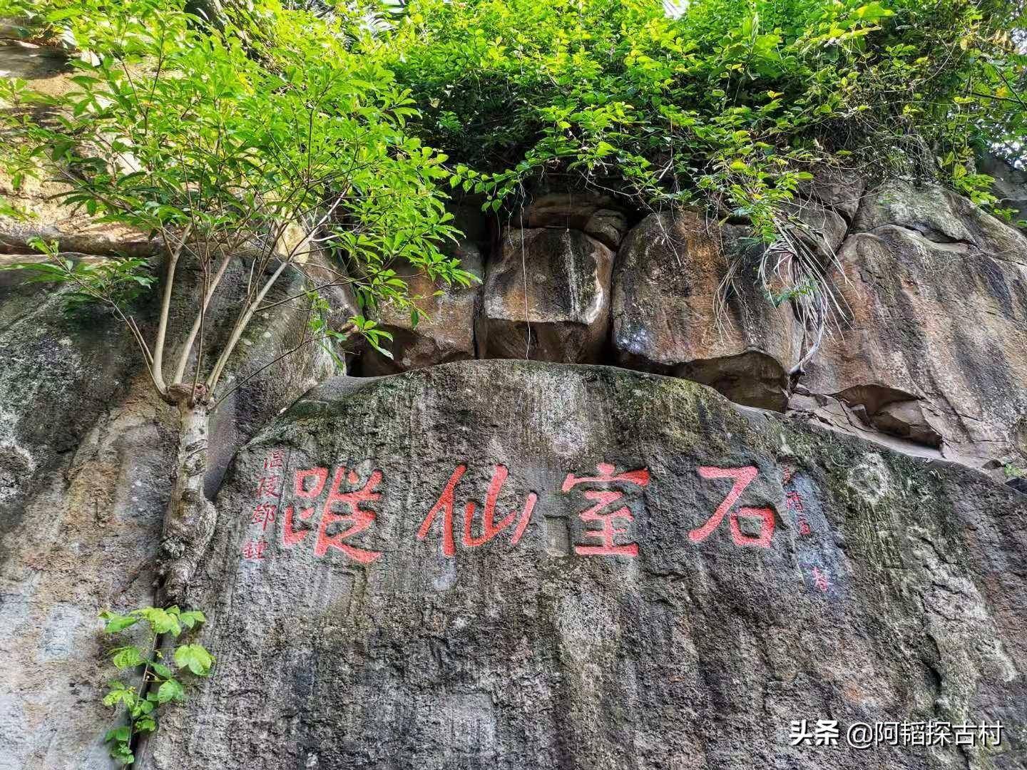 那片石头山有面巨大的石壁,上方凿刻“石室仙踪”,落款处刻着“温陵邓忠”,时间为明朝万历年间,相信此处为“仙人峒”所在地。