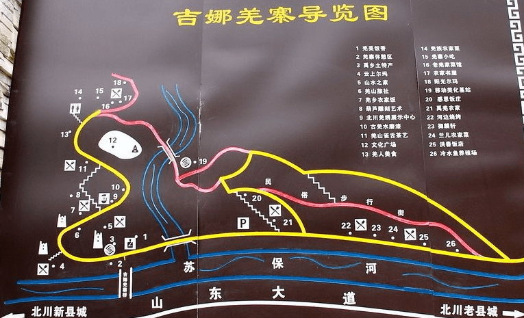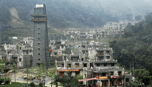 2、吉娜羌寨在擂鼓镇猫儿石村,105国道曲山镇南,多是地震后新修建的院落,碉楼外墙淡雅素洁,房顶上白石兀立,插着各式羌字旗。家家户户大门上挂着羊头骨,篝火广场有两座用青石垒砌的灰白色碉楼。