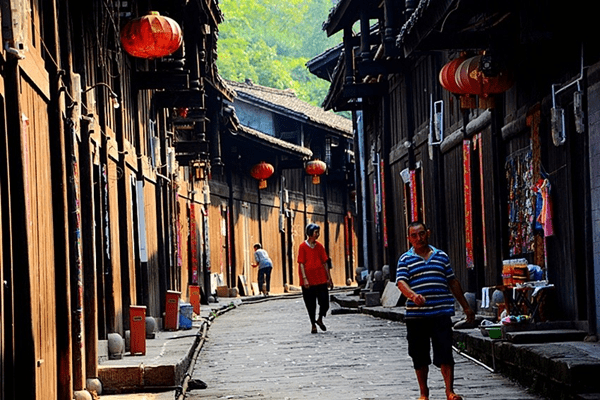 新老两街长约1公里,老街两侧建筑始于明初,新街修于清初,两街被青林溪隔开,由合益廊桥(1808年重建)连接。建筑多紧贴山水,洪汛时最高水位离吊脚楼尺许。现存万寿宫、闽粤会馆、符家大院、黄公祠、邓家大院、雍家碉楼、潼江与青云溪汇合处悬空戏台、过街凉亭等,及水巷子吊桥、西游记取景地、石粱子栈道、水碾小溪、红军学校等,镇上豆腐菜品种类很多很有名。
