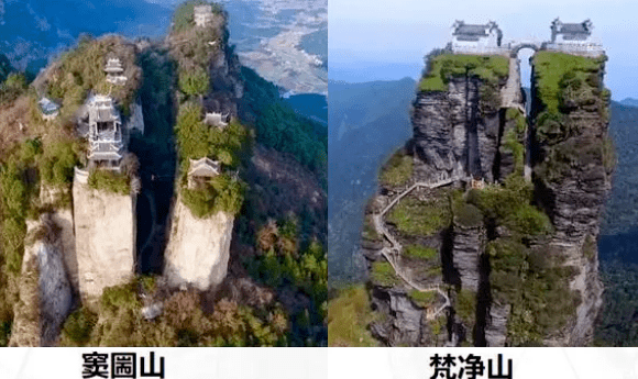 3、窦圌(团)山在江油东北25公里,武都镇团山村涪江东岸,海拔1140米,相对高度608米。山颠三峰顶各有小庙,名东岳、窦真、鲁班,西峰有险路可通,其余两峰由上下两根建于1727年的铁索悬桥相连,每天都有表演者在两根铁索上行走。景区有断桥、天梯、223尊中国历代皇帝石塑,现开发有滑翔、攀岩、滑草、竹筏漂流、网球场等活动。门票67元,农历3月3庙会期间25元,停车10元,索道往返50元,区间车往返30元。