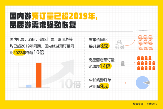 4月19日,飞猪发布了《2023年“五一”出游风向标》(以下简称《风向标》)。距离“五一”假期越来越近,截至目前,国内机票、酒店、景区门票、跟团游等均已超过2019年同期,累计预订量同比去年劲增超10倍,其中,中长线游订单占比高达9成以上。值得注意的是,“五一”假期昆明的高星酒店预订量同比增长超20倍。