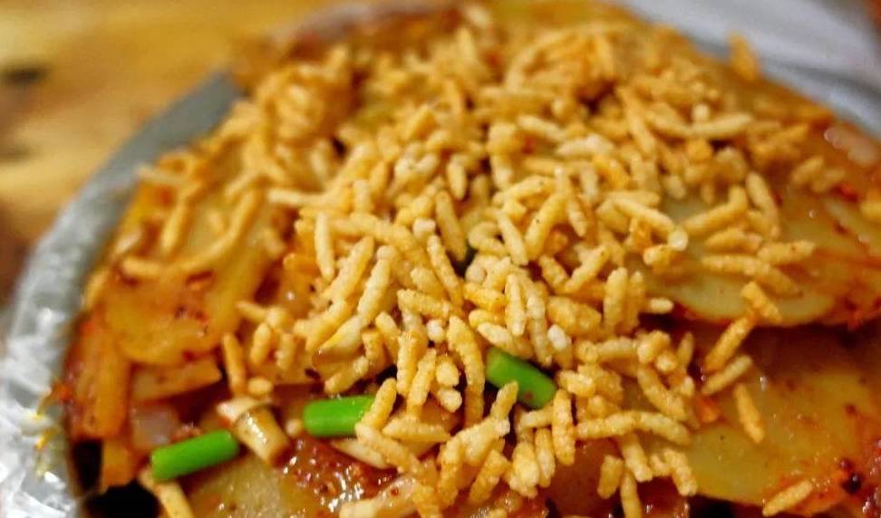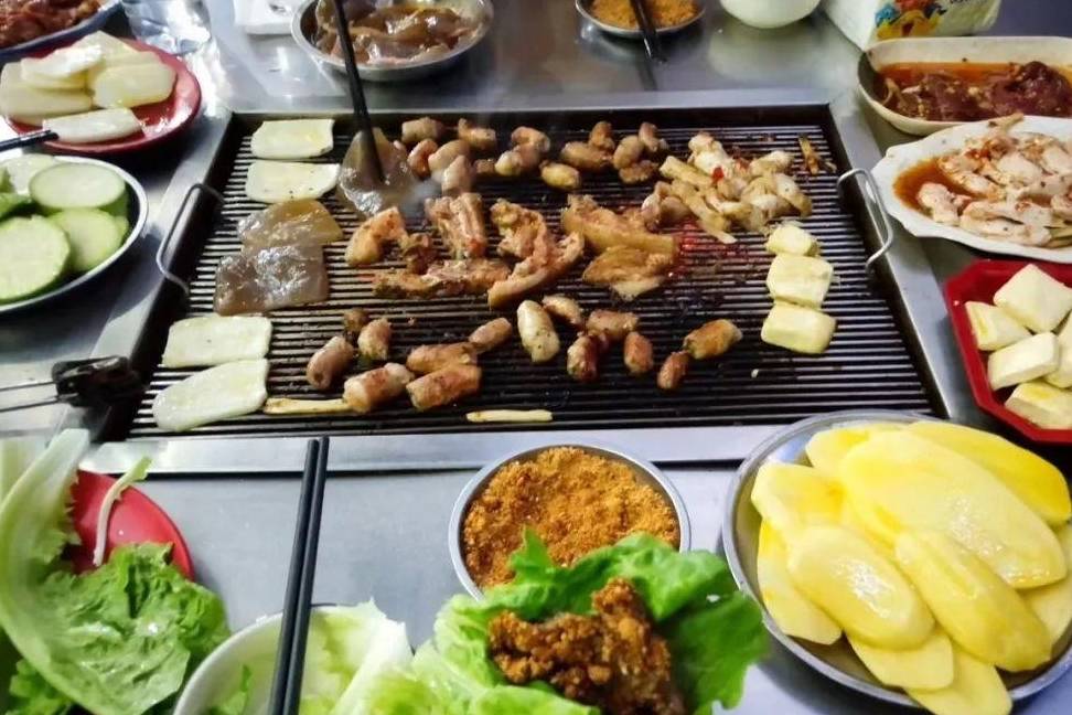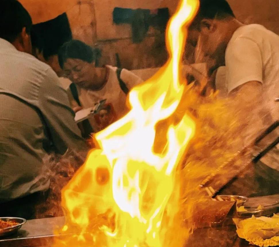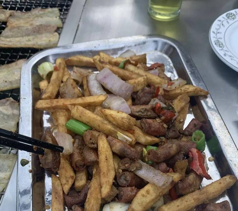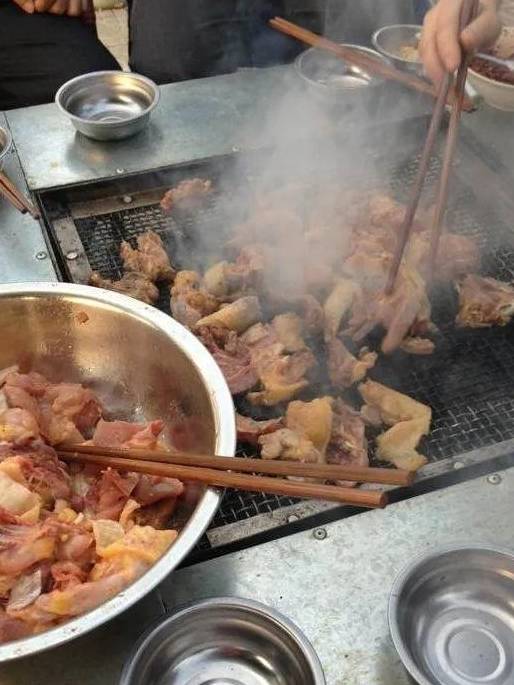 前者是以铁板为烤器,把码了味的菜倒在铁板上,用铁铲不断翻炒。铁板是当地独有的铁板,中间呈蜂窝状。油一多,火就猛,所以对火候的把控要求非常高。