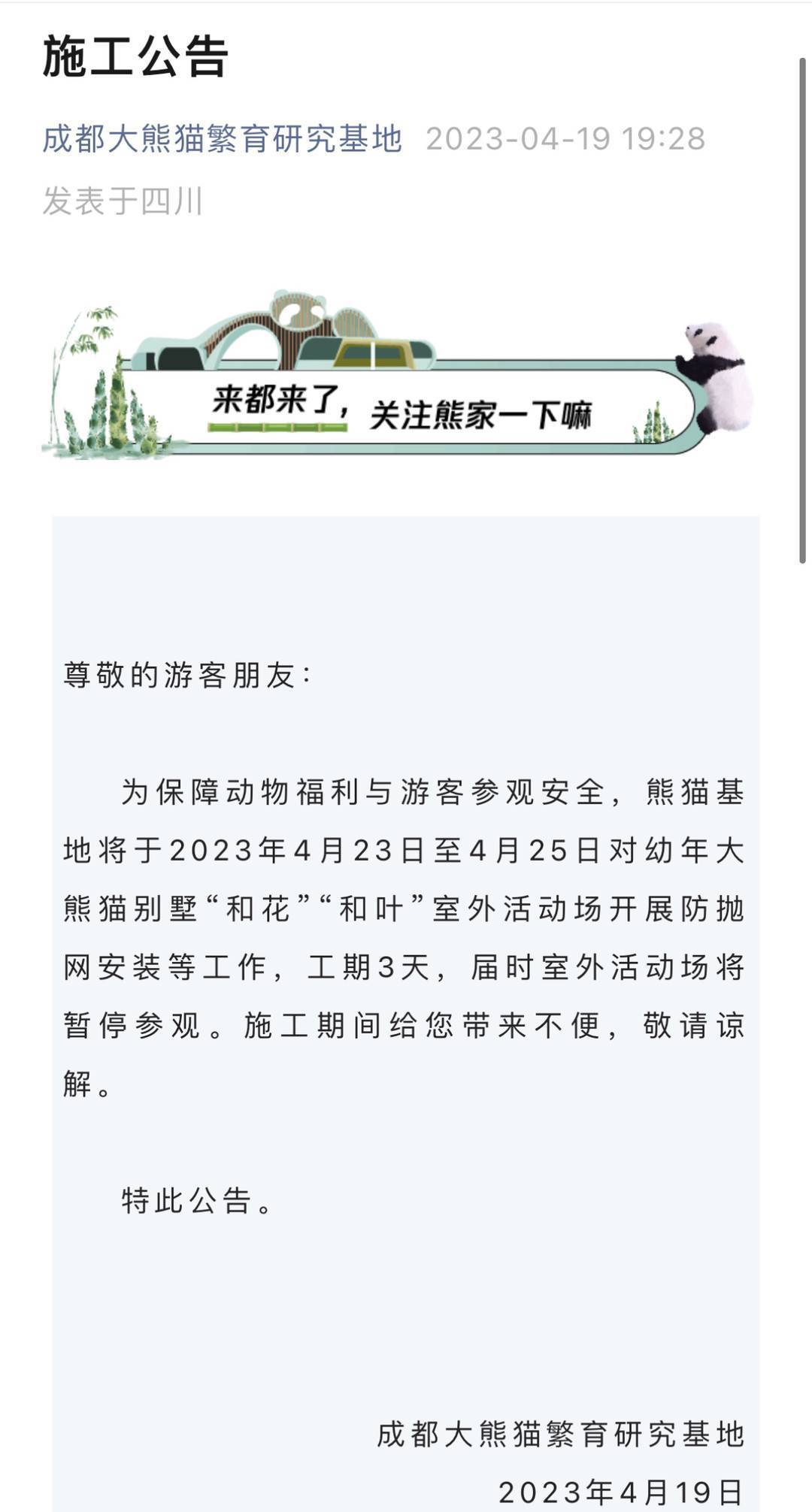 为保障动物福利与游客参观安全,熊猫基地将于2023年4月23日至4月25日对幼年大熊猫别墅“和花”“和叶”室外活动场开展防抛网安装等工作,工期3天,届时室外活动场将暂停参观。
