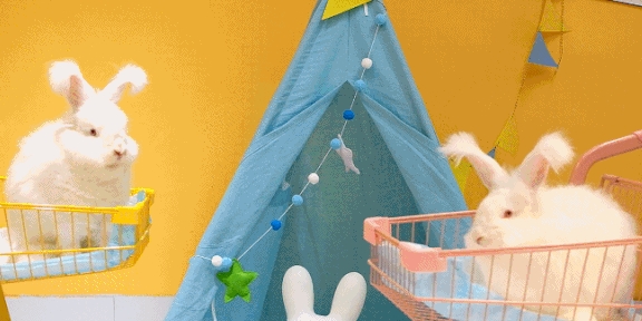 可以把它抱进黄色的小推车内,带着它在馆内闲逛哦!柔柔软软的兔纸超大一只,真的很像一只巨型毛绒玩具!
