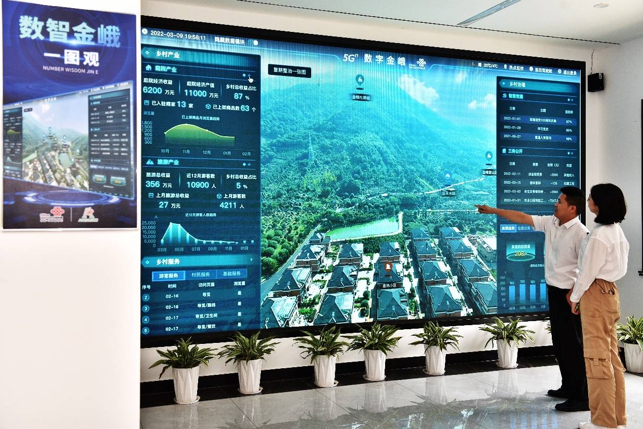 和自然景色相映衬,同样焕发魅力的还有“数字图景”。中国联通助力金峨村打造数字乡村平台,将信息技术与乡村治理、民生服务、乡村发展相融合,以“一图观全貌、一键吃住行、一馆游乐购,一店轻创业、一码促共富”五大数字化应用场景开创发展新格局,让游客进村、让农货进城。