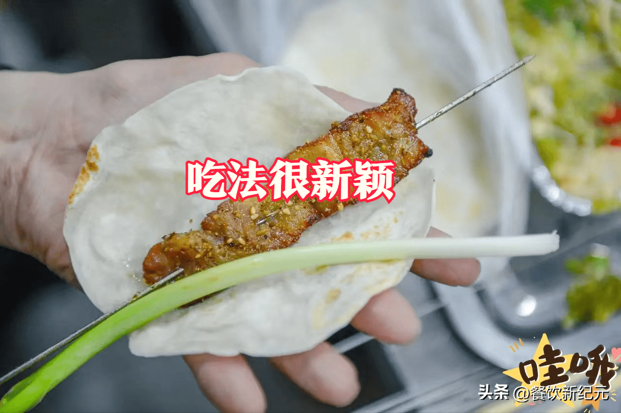 小饼夹着烧烤的五花肉一起吃,不得不说这个吃法还真的很新颖,何智鑫吃了30多年烧烤,还是头一次看到这样吃烧烤的。