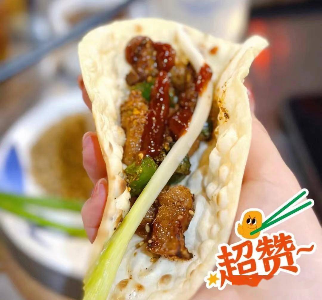 小饼属于当地的烧烤特色之一,点好菜之后,店家便会给食客一包小饼和一把小葱,这种小饼跟山东传统的单饼卷很类似。