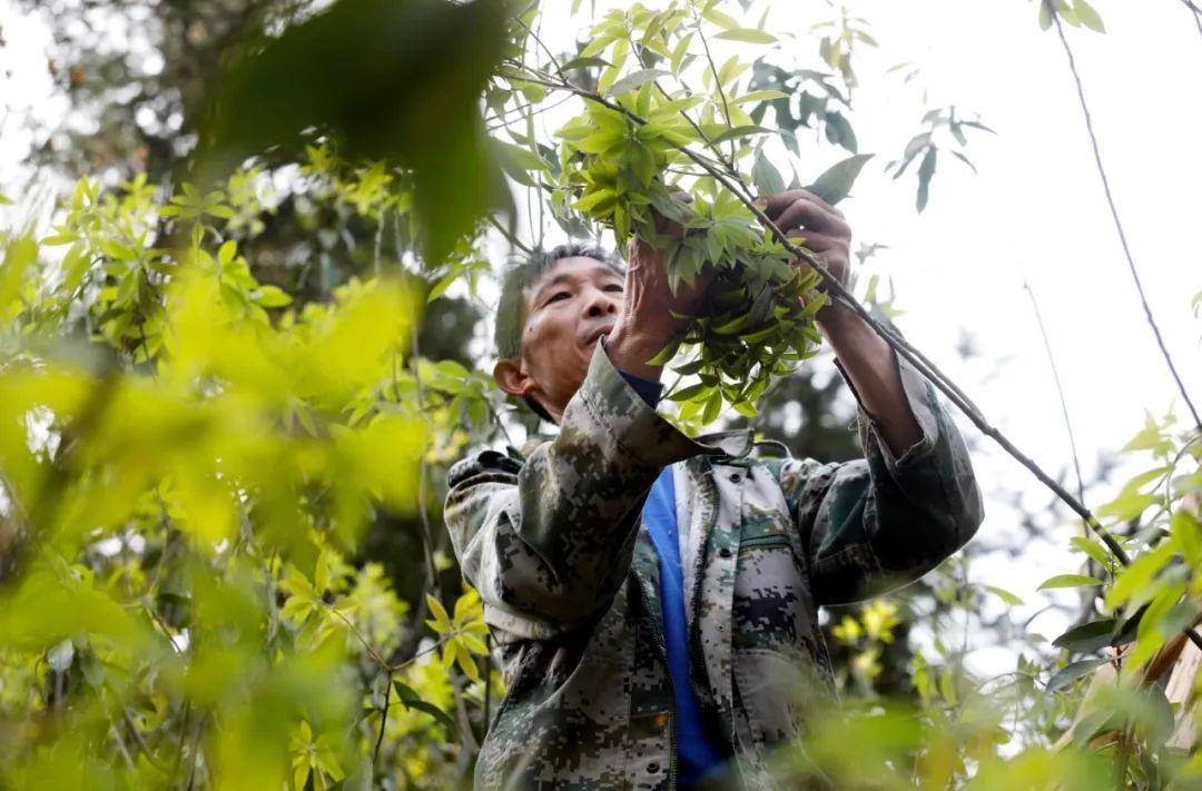 ▲铁门乡铁门社区,老鹰茶制作技艺第三代传承人谭春发在采摘老鹰茶。