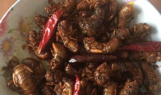 金蝉在山东叫法不同,聊城叫“结了龟”,临沂则叫“知了龟”。夏夜乡村的树林中没有什么光,很多人带上一个手电筒和一个广口瓶,运气好的话,捉上几十个没有问题。回家后当晚将这些活着的小“多肉”撒上盐,第二天中午就可以用油炸了。炸好后颜色金黄,又酥又香,吃到嘴里那种美味简直无法言表。但很多南方人是不喜欢吃金蝉的,觉得这是一种在地下爬出的虫子,有点脏和恐怖,正如我们北方人无法理解南方人敢于吃蛇一样。