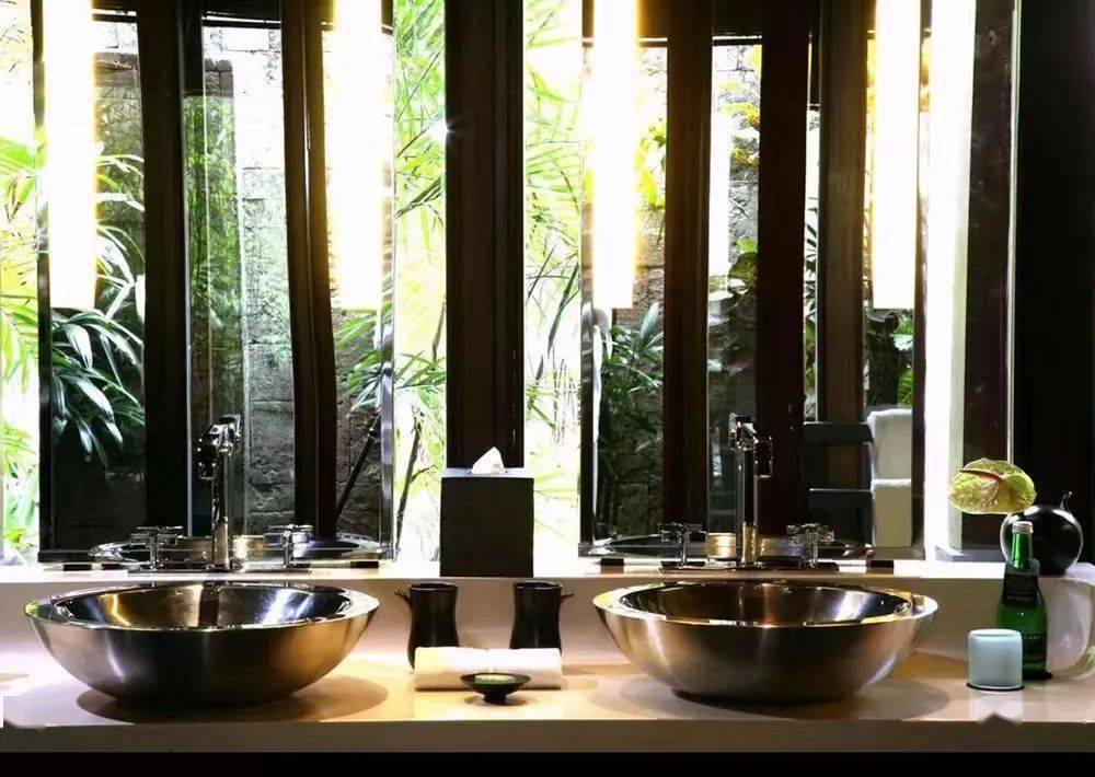 别墅的浴室则是使用了大量黑色水磨石建造而成的,独特流畅的线条设计,让浴室的颜值及使用感都提升了不少。