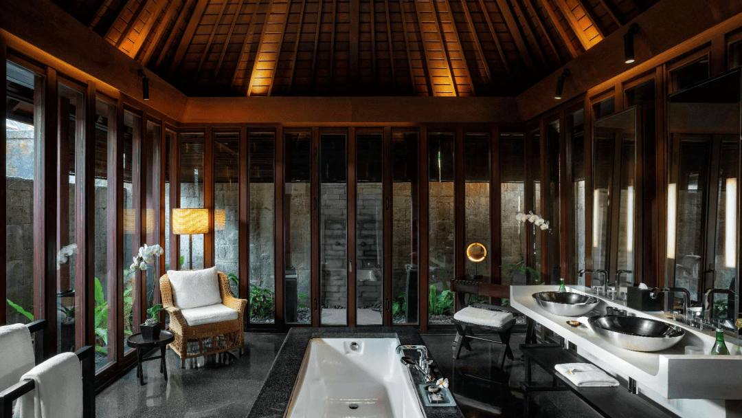 酒店的别墅设计被称为“一步之间”,译为宾客可以几乎在一步之内起床、位于客厅、甚至说淋浴时都可以直接观赏到整个泳池花园的美景。