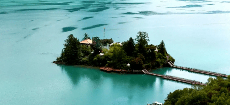初见巴松措,一湖碧水动人心魄, 湖水随太阳位置在深蓝与碧绿间切换,树木五彩斑斓,岛上错宗工巴寺庙更具神秘色彩。
