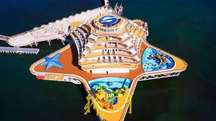 从二期平台西侧的游客专属码头登陆,便可来到整体呈五角星形、面积8000平方米的主甲板区域,这里设有成人泳池、儿童水乐园、户外休闲演艺等功能板块;上建主体部分设计有7层面积10000平方米的室内空间,分别设置了综合保障区、海洋渔业科普展厅、餐饮庆典区、宾客住宿区,最大载客量为1000人,具备渔业休闲、海洋科研、海上住宿、会议餐饮等功能。