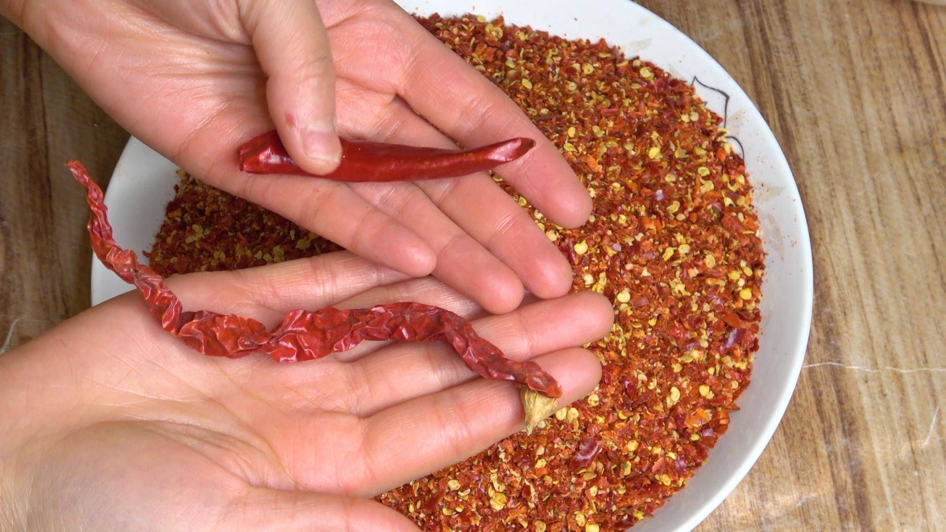 首先,准备200克辣椒面,由河南新一代辣椒和四川二荆条辣椒混合而成。上图中的短辣椒是新一代河南辣椒,而长辣椒是四川二荆条辣椒。河南新一代辣椒的特点是微辣,色泽鲜红色,非常香。四川二荆条辣椒的特点是色泽鲜艳,与河南新一代辣椒的香气不同。它几乎没有辛辣的味道。如果你喜欢辣的食物,你也可以加一些贵州子弹头辣椒。