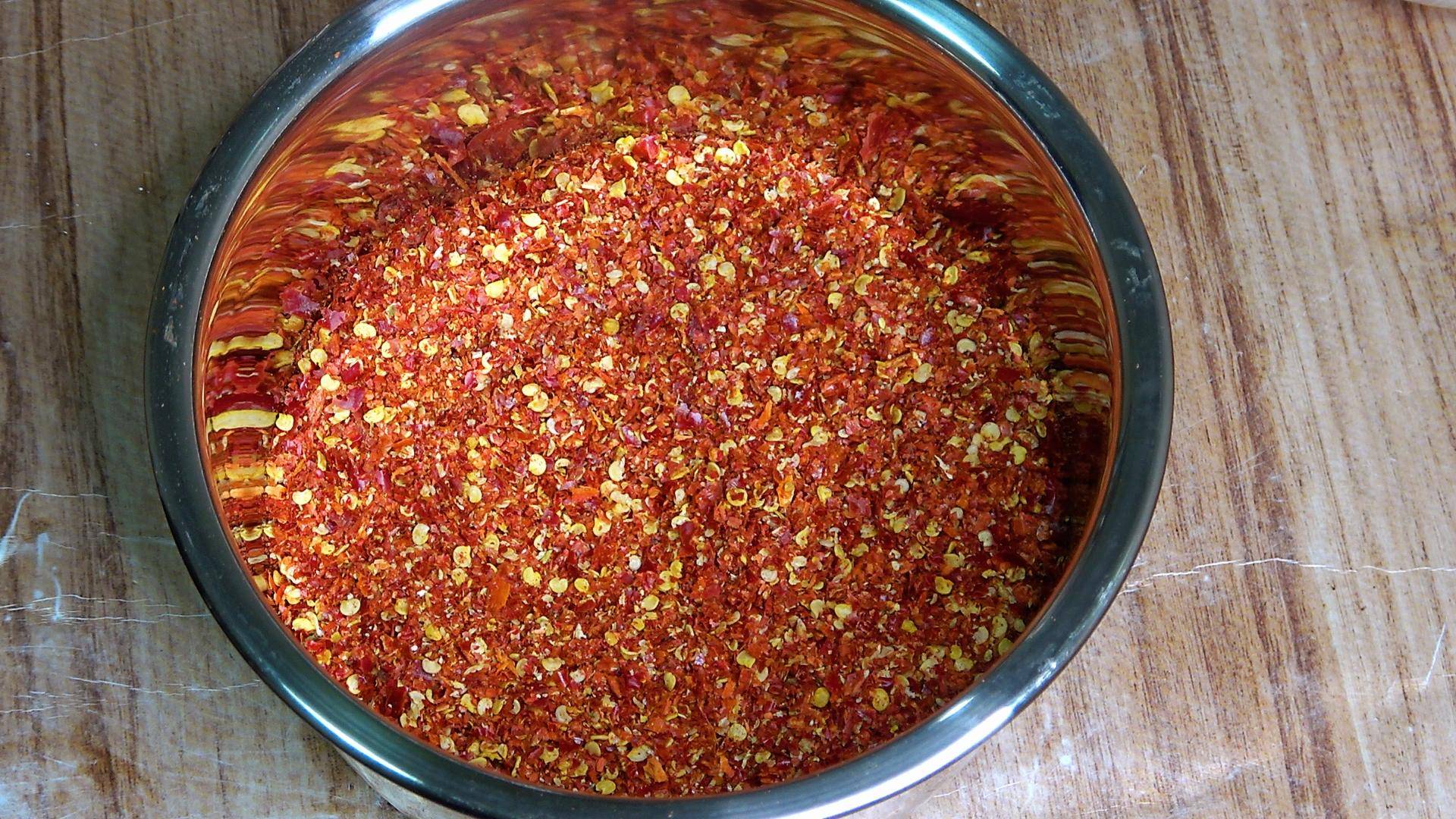 因为我家里没有研磨机,所以我请干货店的老板帮我做粉末。辣椒粉不要打得太细,要稍微浓一点,使辣椒油有香味。接下来,准备一个装有辣椒油的容器,它应该耐高温,最好有盖子。将一半辣椒面倒入容器中,另一半备用。