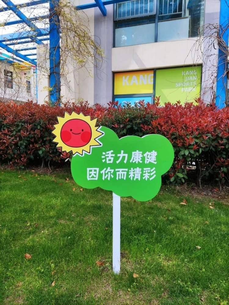 康健人家门口的好去处——社区体育公园内,一个个小巧精致的公益广告指示牌分布在公园醒目位置,提醒前来锻炼的居民和小朋友们爱护绿植、文明运动。这些小小标识牌,既为公园增添了一道道靓丽的风景,还内“藏”大文明,让文明之美,起于心,落于形。