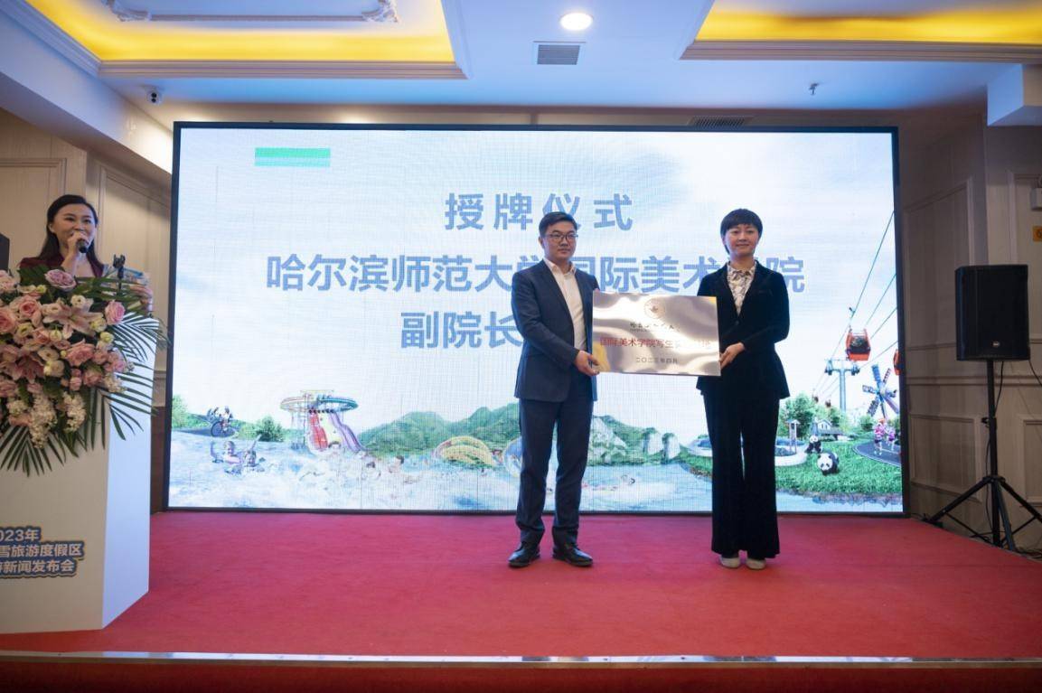 哈尔滨师范大学国际美术学院副院长徐小晴(右)为亚布力授牌(央广网发 亚布力管理委员会供图)