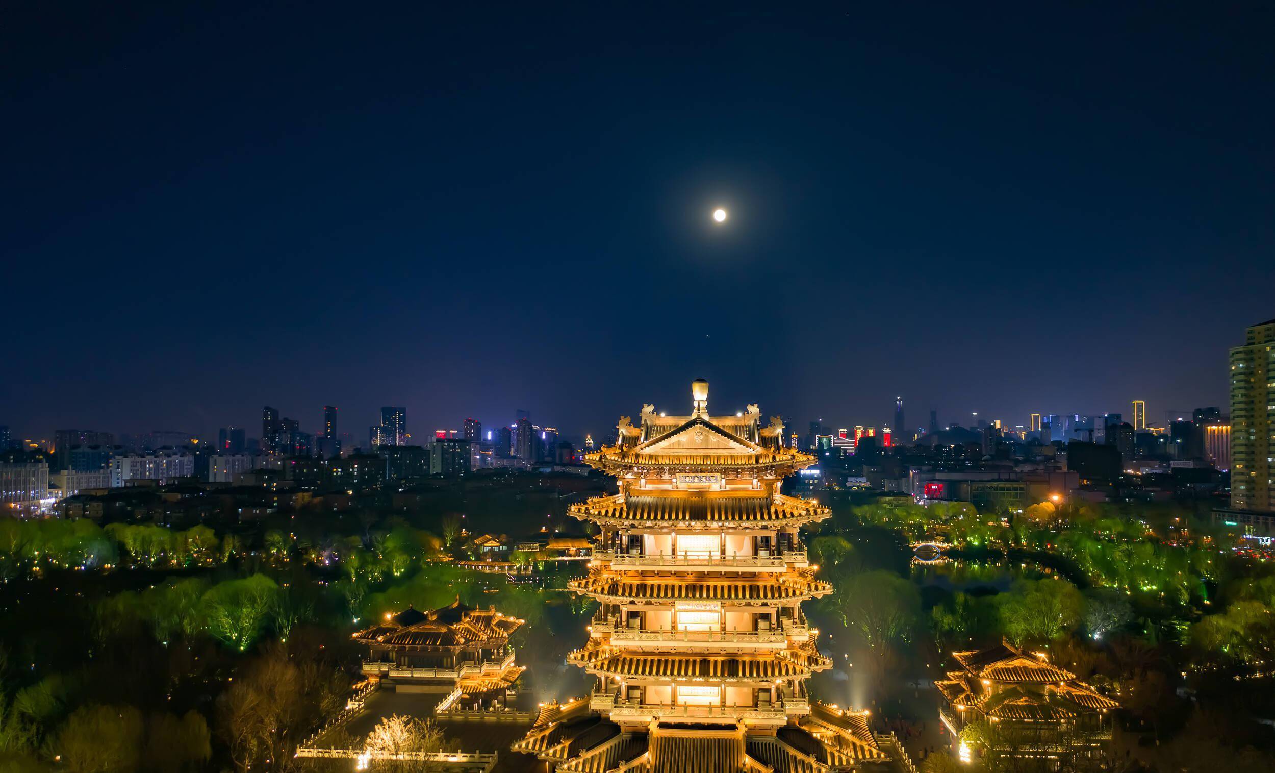 伴随着夜色,超然楼陡然走红,源自人们与美好生活的双向奔赴,也源自文化的创新表达,而这一切更得益于济南“一湖一环”亮化工程的实施。2016年,为落实“打造四个中心,建设现代泉城”的战略部署,彰显泉城“美丽山水城市”特色,济南市启动城市重点区域景观亮化规划与设计编制调研工作。历经两年建设,泉城独特的历史韵味和文化特色在绚烂多姿的灯光中绽放,超然楼便是其中一个重要构成。如今的超然楼,结合楼身高耸的造型,灯光层层变化,色调由暖黄光到中性白光,建筑层次在灯光的映衬下更加分明,超然楼“超然致远”的形象愈加突出。外观颜值的软实力形成了“出圈”的硬支撑。