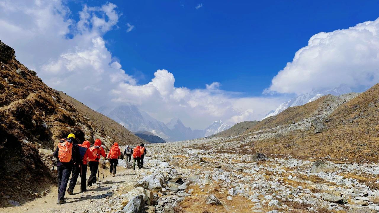 继续向上,风中掺杂着喜马拉雅冰川的寒气,气温也越来越低,风力也开始飘忽不定,有时一阵横风吹过,甚至让人无法直面,感觉随时会被吹走,全程必须戴好头巾与运动眼镜。常规的速干衣也不能满足当时的气温了,必须穿好抓绒与冲锋衣。为了防止队员掉队,走在前面的队员,会稍作等待,等大家穿戴好装备后,向着罗布切再次进发。