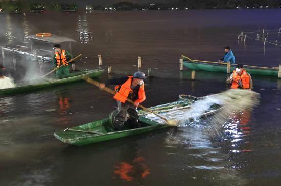 夜间妆点西湖,更需匠心。淡淡月光下,装备佩戴整齐的工作人员们到达“清塘”区域,根据分工分组紧密配合,将按比例兑好的漂白粉等混合剂从边缘开始均匀洒在“清塘”区域内。待到次日清晨,“休整”一夜的西湖将重新恢复清澈、有序。