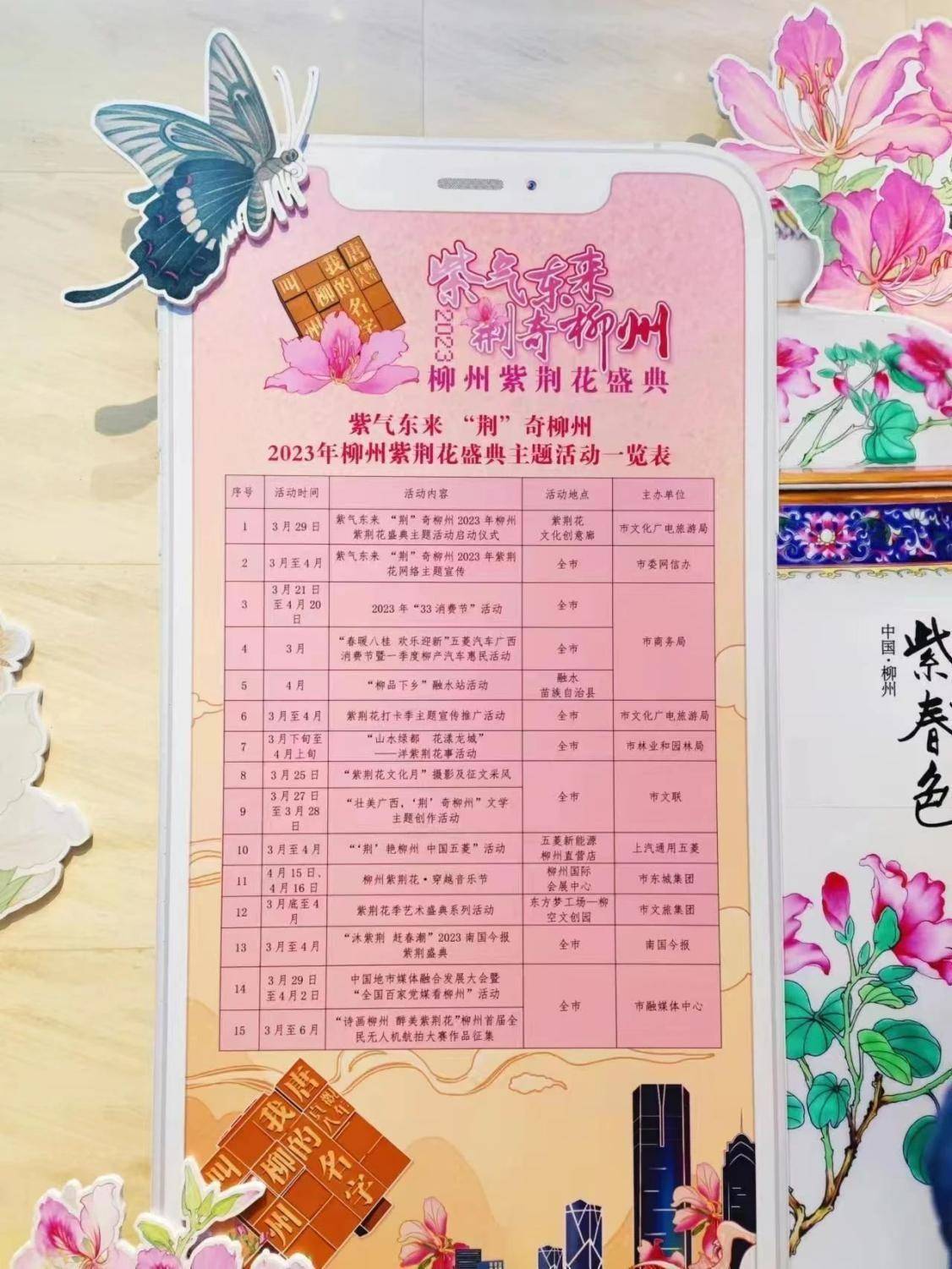 紫荆花电子手绘地图、“嗍粉公交”和“赏花公交”专线、特色场景打卡点和花式拍照服务、定制紫荆花潮装和潮改车、巨幅手绘网红阶梯、紫荆花科普活动、柳州紫荆花·穿越音乐节、33消费节、“春暖八桂 欢乐迎新”五菱汽车广西消费节等精心策划的服务和活动,一定能让大家感受到柳州的实力宠粉。