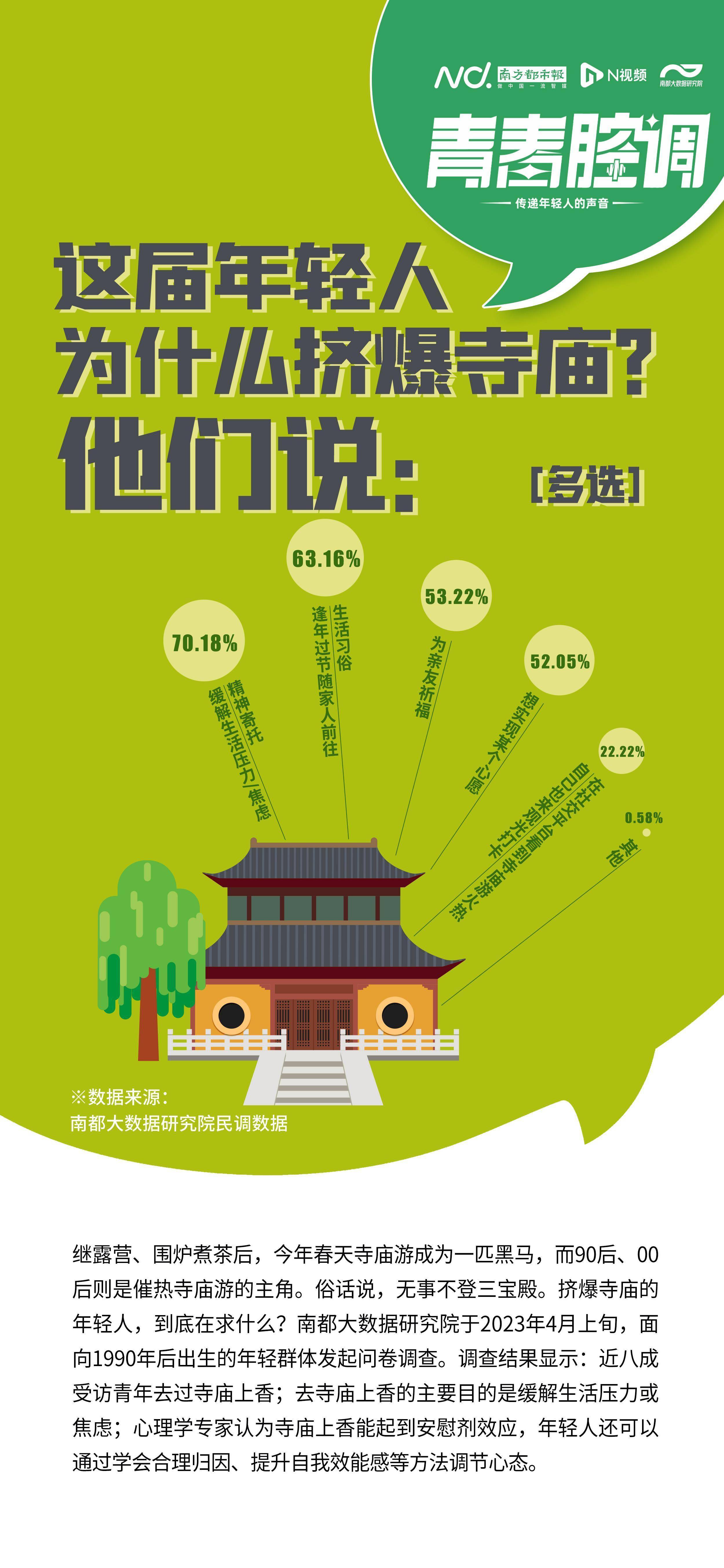 继露营、围炉煮茶后,今年春天寺庙游成为一匹黑马,而90后、00后则是催热寺庙游的主角。俗话说,无事不登三宝殿。挤爆寺庙的年轻人,到底在求什么?南都大数据研究院于2023年4月上旬,面向1990年后出生的年轻群体发起问卷调查。调查结果显示:近八成受访青年去过寺庙上香;去寺庙上香的主要目的是缓解生活压力或焦虑;心理学专家认为寺庙上香能起到安慰剂效应,年轻人还可以通过学会合理归因、提升自我效能感等方法调节心态。