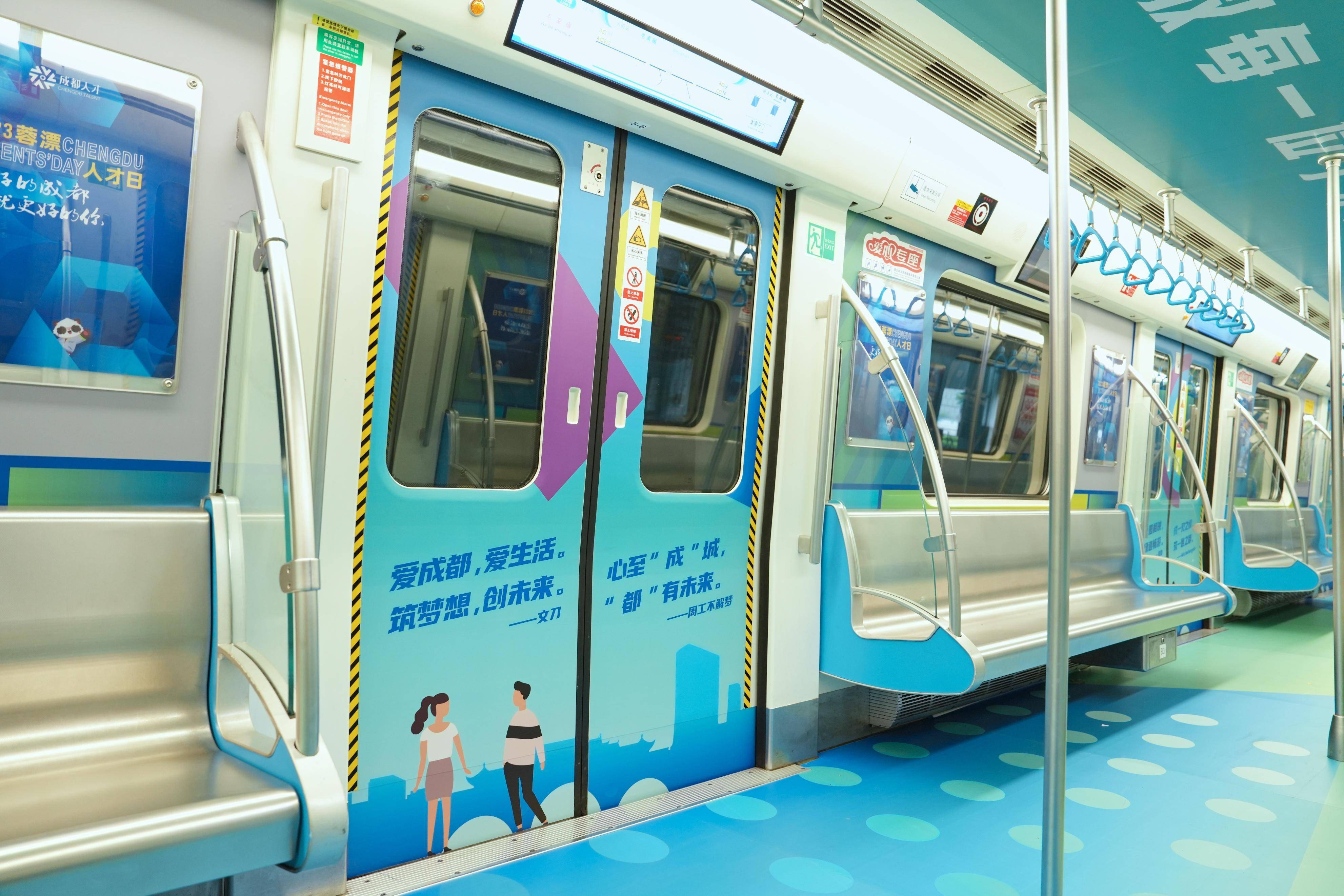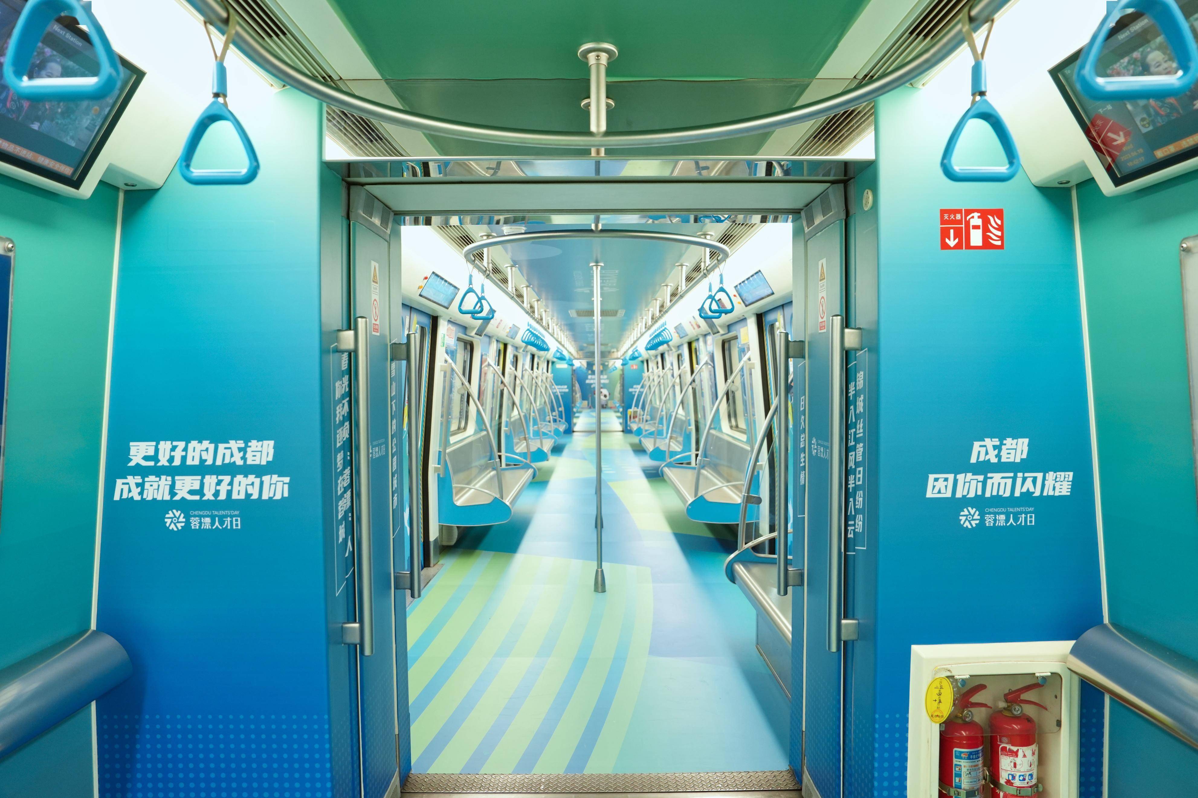 三四节车厢以最经典的“蓉漂”青绿色系为主,通过介绍“蓉漂人才日”、“蓉漂”青年人才驿站、“蓉漂人才荟”、“蓉漂杯”高层次人才创新创业大赛、“蓉漂人才学院”、蓉城人才绿卡、“蓉漂”人才公园等品牌“产品”政策,切实展示成都友好的人才政策、人文环境,致敬“蓉漂”、礼敬人才。