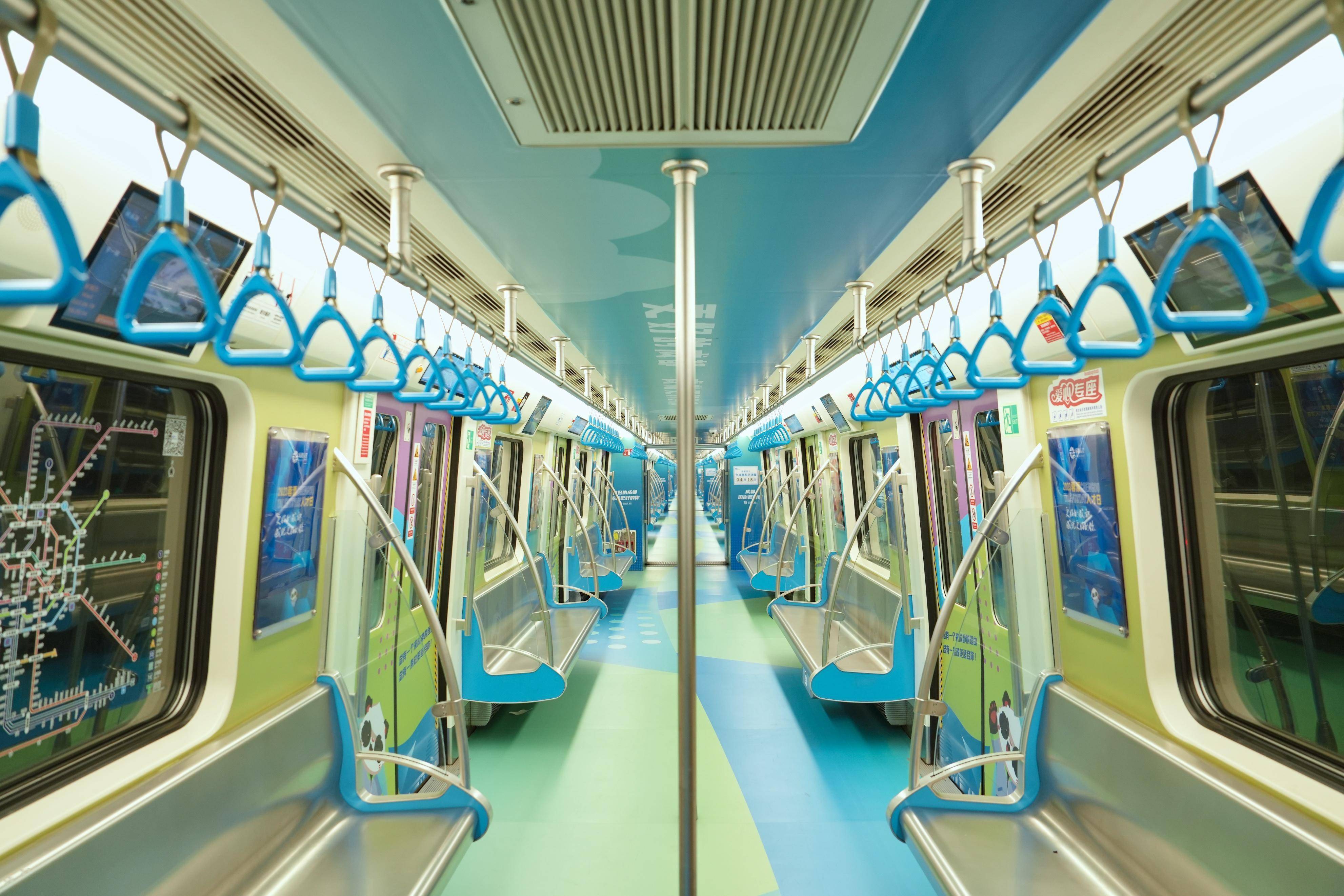 成都,连续14年位居“中国最具幸福城市”榜首,连续16年蝉联全国社会治安最高奖“长安杯”。一二节车厢以“蓉”耀之路为主题,用轨道列车串联城市地标,贯穿车厢头尾,介绍成都的荣誉及“蓉漂”政策,辅以青春活泼的黄绿色系,表达“蓉漂”时代的年轻风尚。