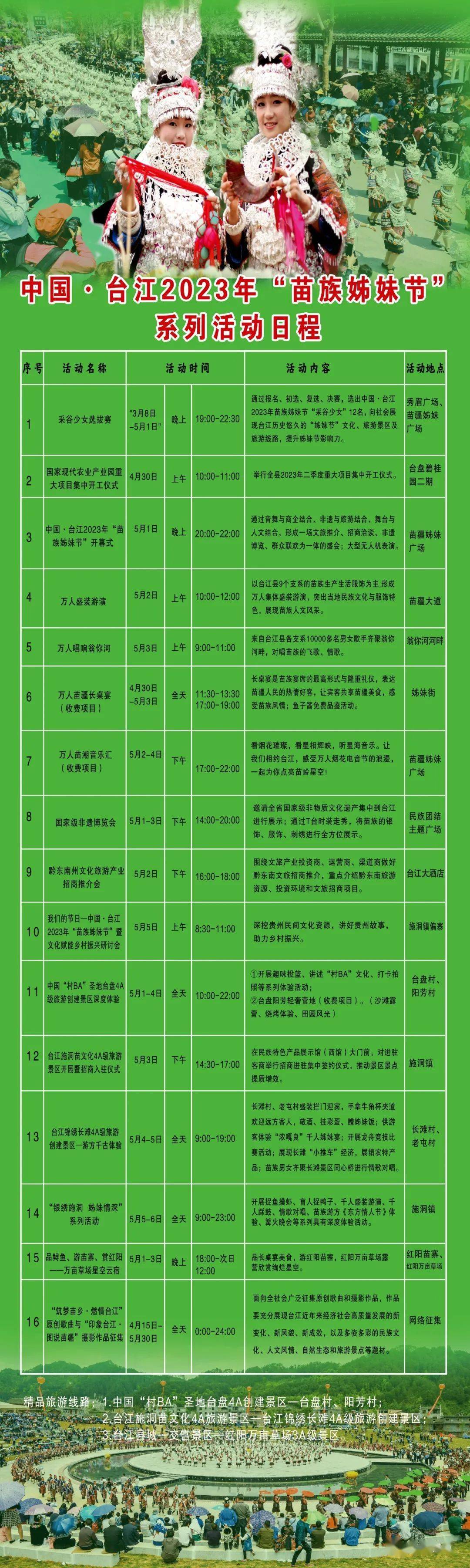 届时,邀请你来中国“村BA”圣地台盘4A级旅游创建景区体验“村BA”文化;到台江锦绣长滩4A级旅游创建景区─游方千古体验;到施洞体验“银绣施洞 姊妹情深”系列活动;到红阳苗寨品鲟鱼、游苗寨、赏红阳——万亩草场星空云
