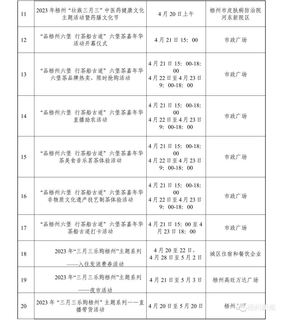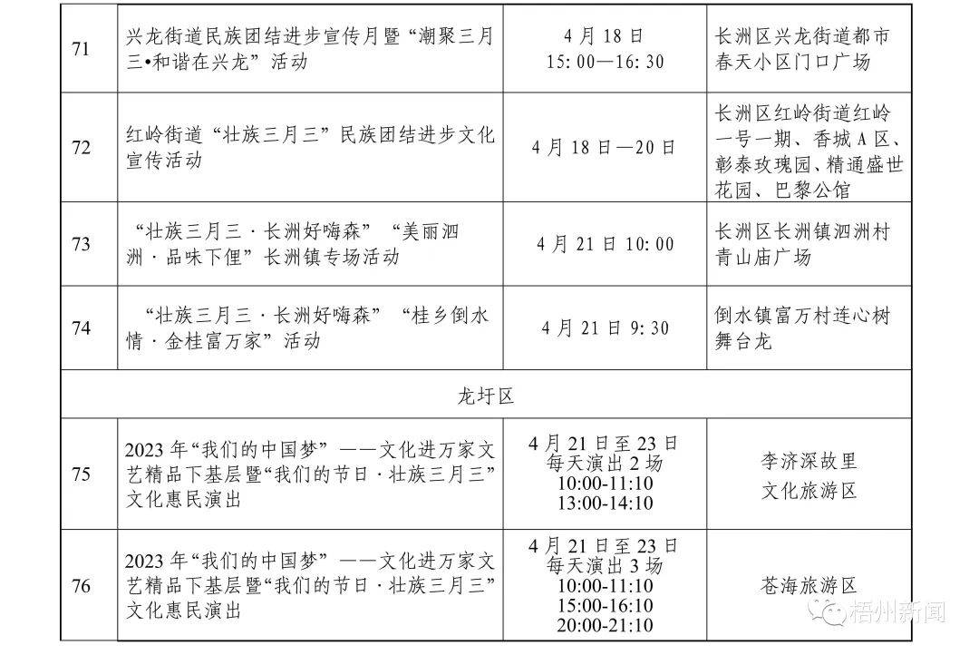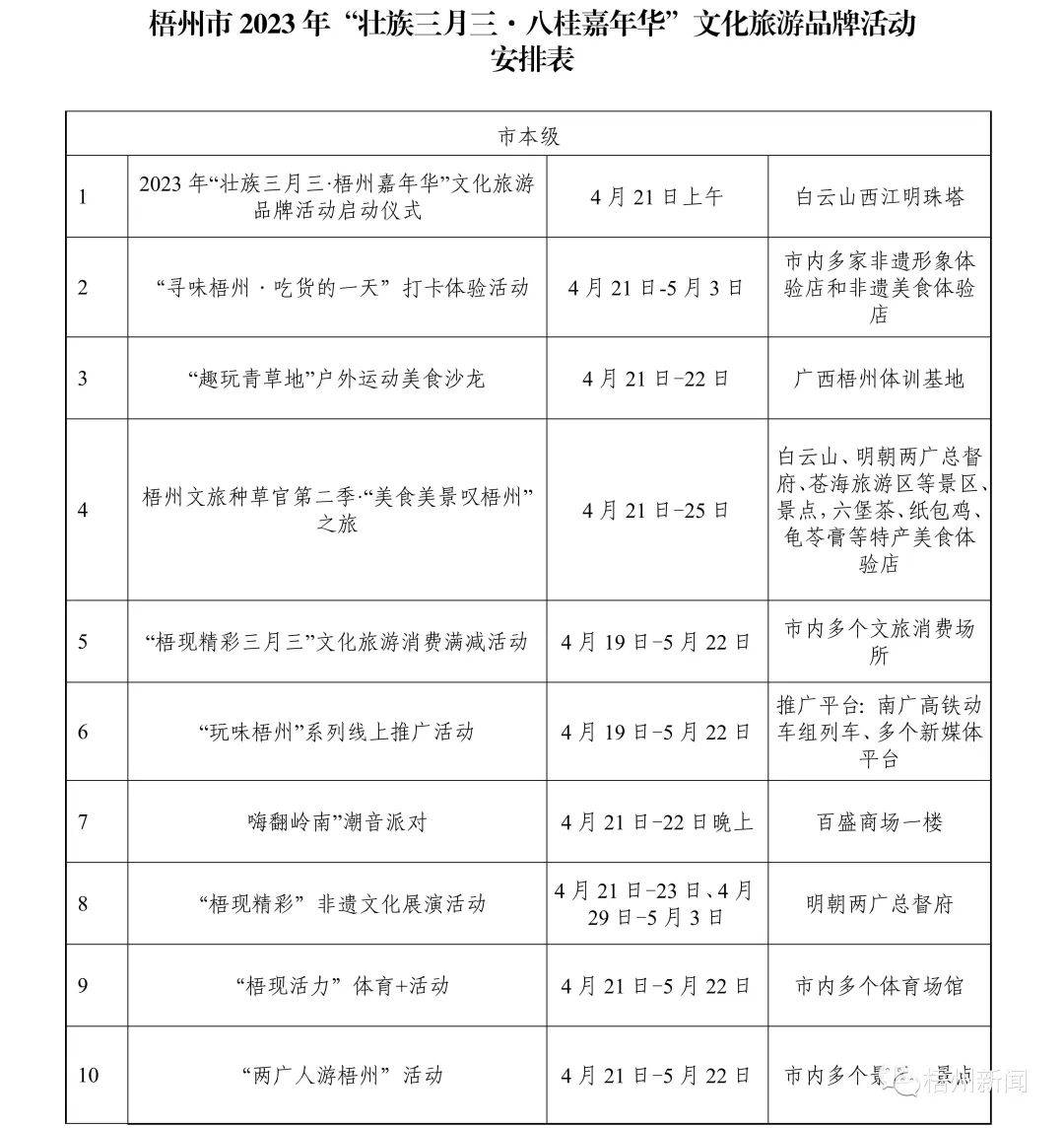 据悉,今年“壮族三月三·梧州嘉年华”文化旅游品牌活动精彩纷呈、值得期待,一系列活动聚焦梧州特色、梧州元素,又突显传统与现代相结合。活动既有粤剧、狮舞、六堡茶制作技艺等传统非遗项目展演,又有潮音派对、旅游达人“种草”推荐等活动,力争推出“爆点”内容,营造线上线下同欢共庆的节日氛围。此外,我市各县(市、区)也将创新活动形式,开展各项民间民俗活动达50多项。