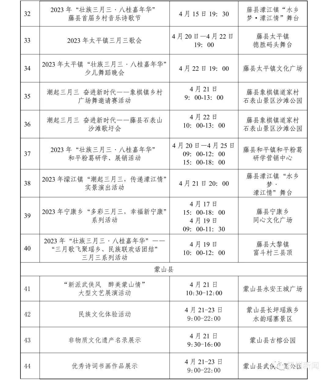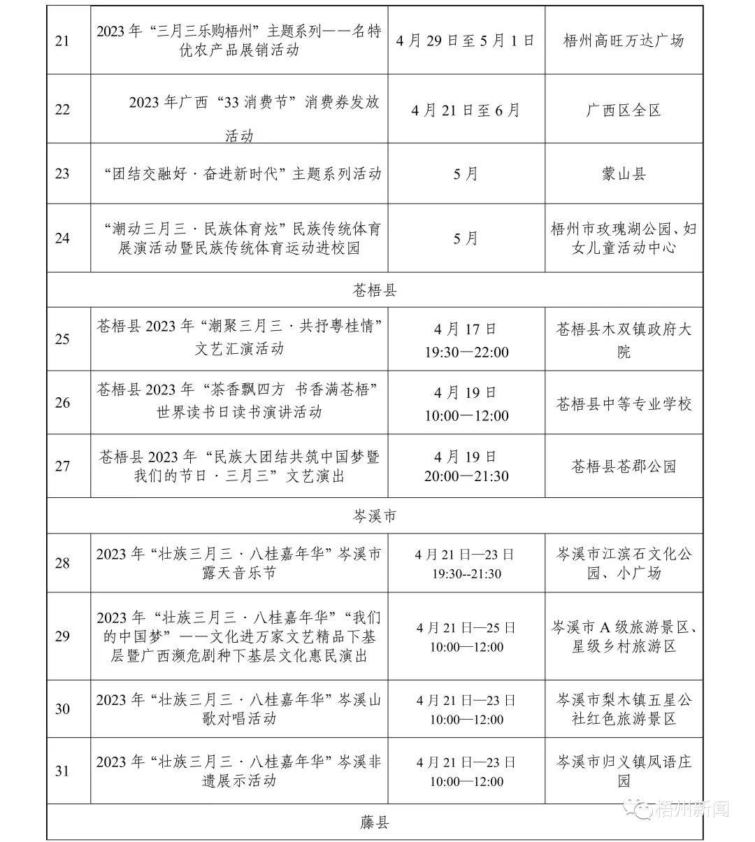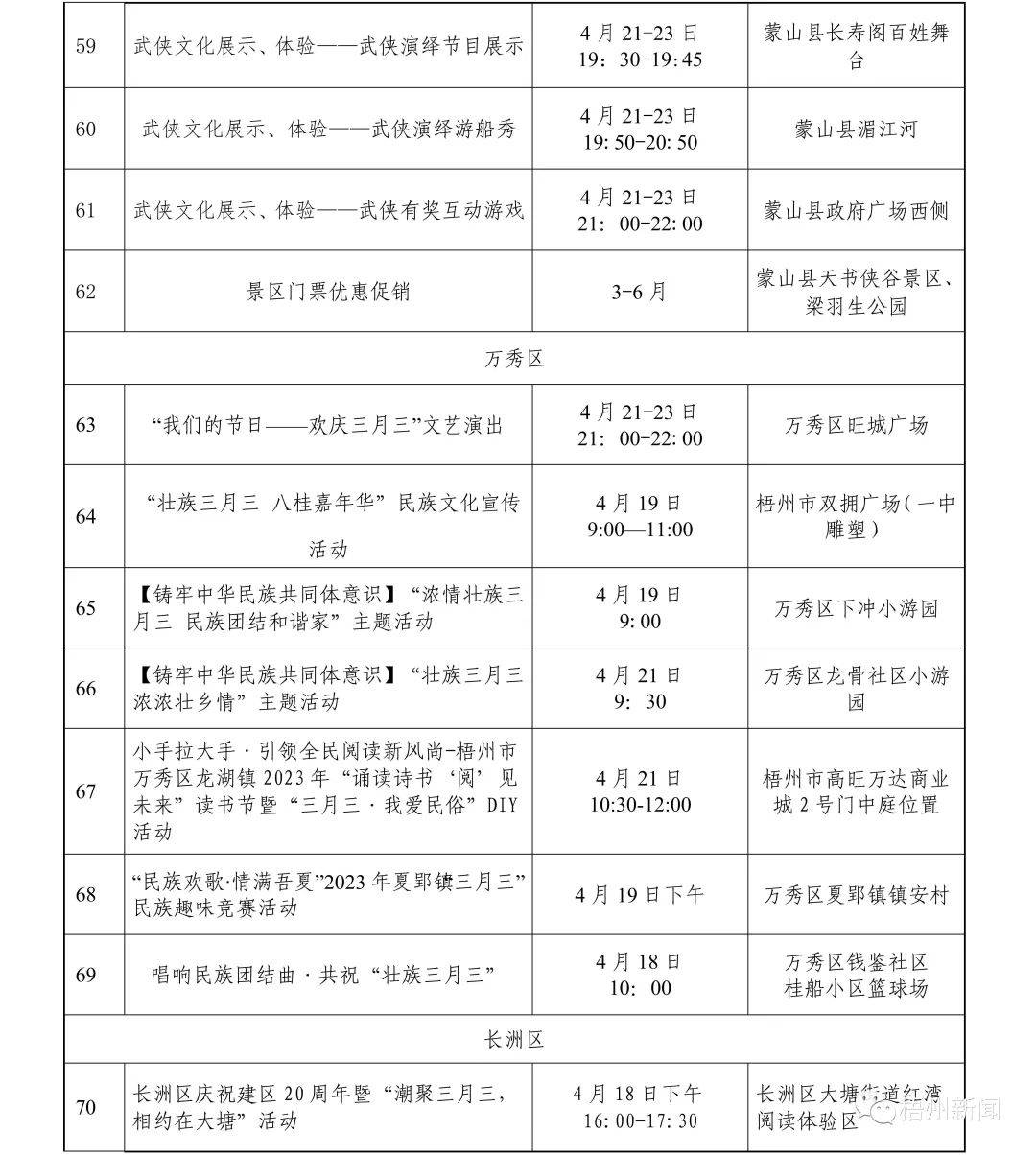 据悉,今年“壮族三月三·梧州嘉年华”文化旅游品牌活动精彩纷呈、值得期待,一系列活动聚焦梧州特色、梧州元素,又突显传统与现代相结合。活动既有粤剧、狮舞、六堡茶制作技艺等传统非遗项目展演,又有潮音派对、旅游达人“种草”推荐等活动,力争推出“爆点”内容,营造线上线下同欢共庆的节日氛围。此外,我市各县(市、区)也将创新活动形式,开展各项民间民俗活动达50多项。