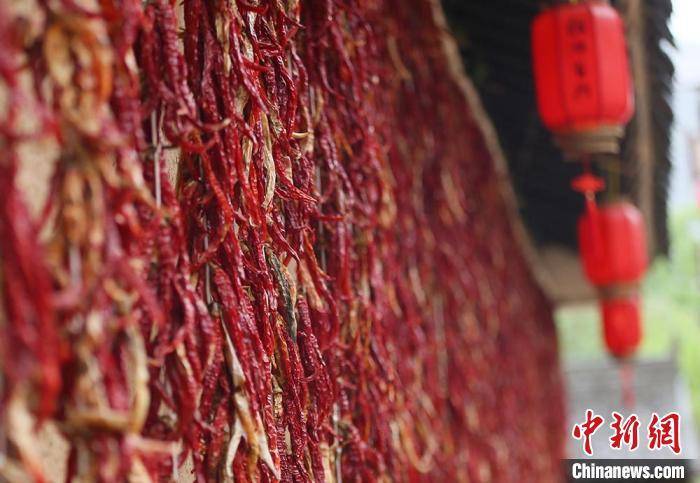 村内黑瓦泥墙、屋宇错落的老房子后挂着一串串红辣椒,铺满了岁月的沧桑。 高展 摄