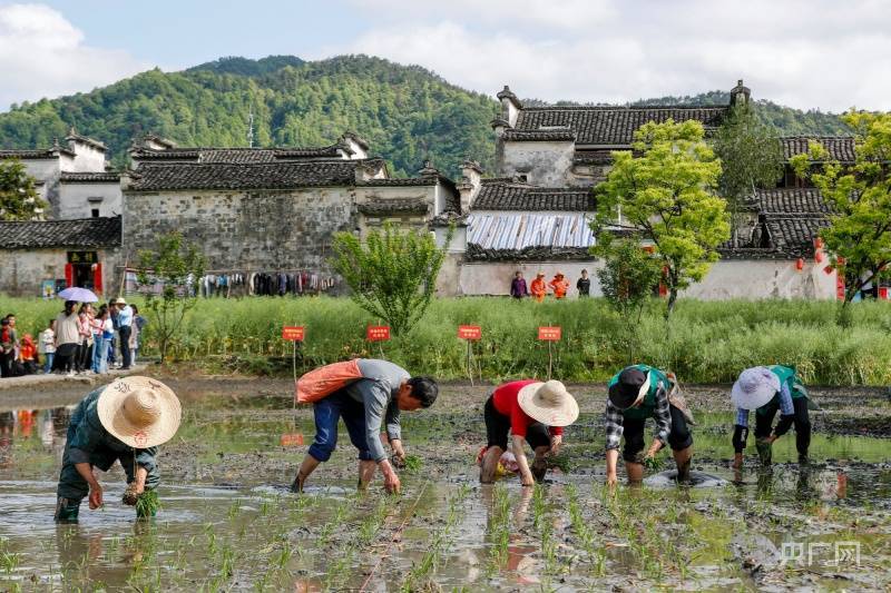 村民在安徽省黄山市黟县西递古村落比赛插秧(央广网发 施亚磊摄)