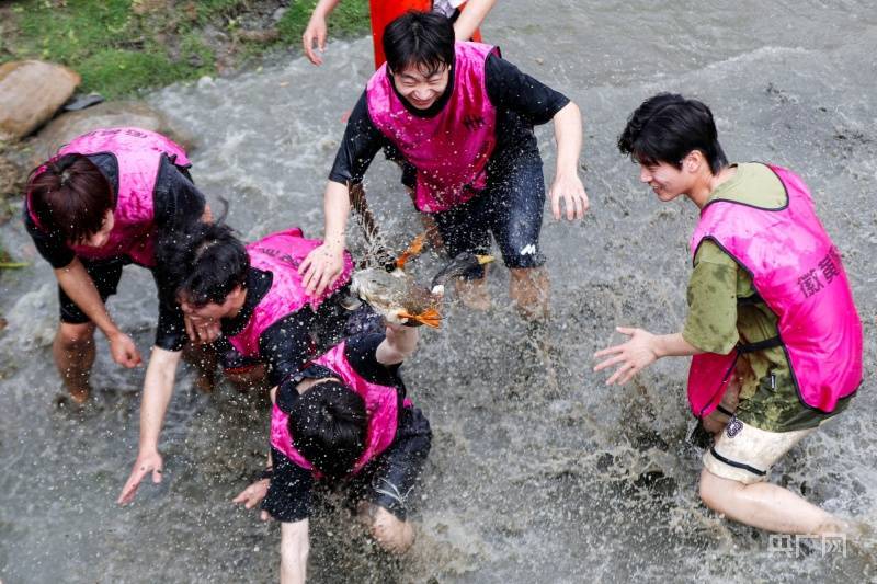 游客在安徽省黄山市黟县西递古村落比赛抓鸭子(央广网发 施亚磊摄)