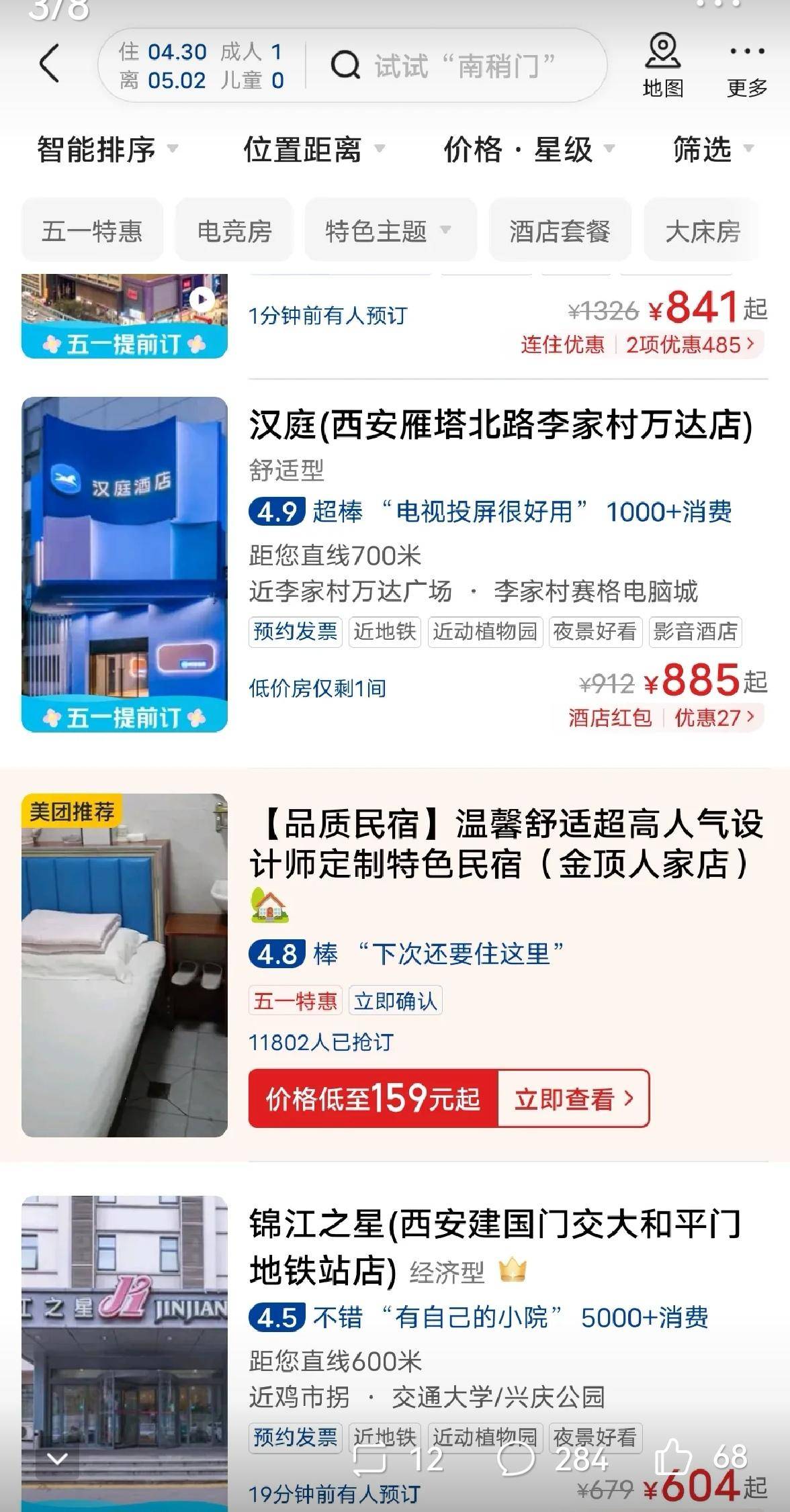 虽然距离“五一”假期还有近10天时间,但旅游市场的热度早已经开始飙升。记者从多个平台预测数据看到,西安多个平台“霸榜”国内出游热门目的地城市。美团、大众点评数据显示,今年“五一”假期国内游“提前订”创五年来新高,截至4月10日,住宿、交通、景点门票等预订量较2019年同期增长约200%,住宿预订更是提早两周。“一房难求!预计今年生意会火,但是完全没想到会这么火!”西安广成酒店的一位大堂经理说。正如她所言,西安等多个城市已成为国内热度最高的十大目的地城市。这些特色城市的“五一”假期客房紧张,不少酒店提前售罄。数据显示,截至目前“五一”假期的酒店价格环比上月上涨超过7成,其中部分热门景区、商圈酒店更是暴涨数倍,很多经济连锁酒店也已突破500元/晚。不少网友调侃称,感觉遇上了“酒店刺客”。