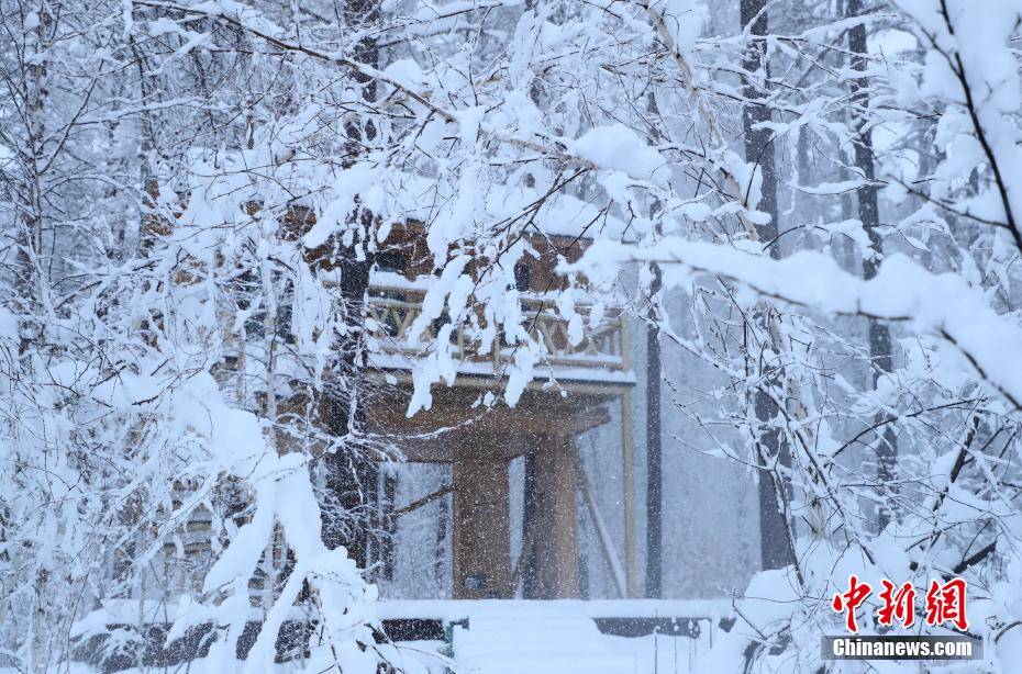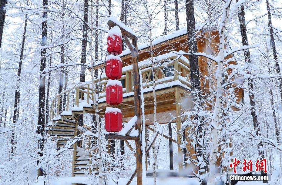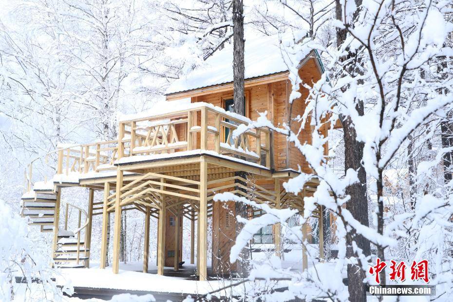 近日,内蒙古自治区呼伦贝尔市鄂伦春自治旗普降大雪,位于内蒙古大兴安岭腹地的阿里河国家森林公园秒变童话世界,银装素裹,皓然一色。白雪为森林披上一层纱衣,木屋、树屋在瑞雪的掩映下,宛若人间仙境。图为树屋为春雪后的森林增添浪漫。
