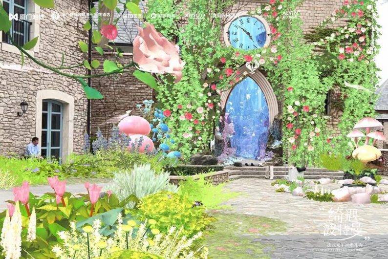 巨型玫瑰花在城堡门口微微探出,花丛随着风吹的方向摇曳生姿,走近水井,就好像触发了机关,瞬间变成带有发光星辰的魔法阵,打开城堡大门,一个神秘的海底世界出现在你的眼前……这个融合了法式浪漫与科技感的画面不是梦境,而是AR技术助力下的厦门特房波特曼七星湾酒店——怡海小镇元宇宙婚礼场景。